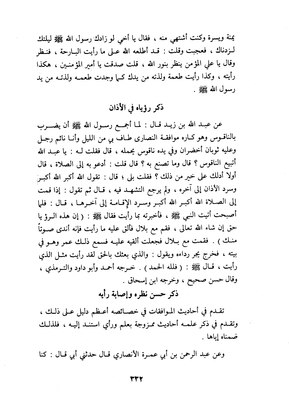 عن عبد الله بن زيد قال: لما أجمع رسول الله -صلى الله عليه وسلم- أن يضرب بالناقوس وهو كارهموافقة النصارى, طاف بي من الليل وأنا نائم رجل وعليه ثوبان أخضران وفي يده ناقوس يحمله، قال: فقلت له: يا عبد الله أتبيع الناقوس? قال: وما تصنع به? قال: قلت: أدعو به إلى الصلاة، قال: أولا أدلك على خير من ذلك? فقلت: بلى؛ قال: تقول: الله أكبر الله أكبر وسرد الأذان إلى آخره، ولم يرجع التشهد فيه، قال: ثم تقول إذا قمت إلى الصلاة: الله أكبر الله أكبر وسرد الإقامة إلى آخرها، قال: فلما أصبحت أتيت النبي -صلى الله عليه وسلم- فأخبرته بما رأيت فقال صلى الله عليه وسلم: "إن هذه الرؤيا حق إن شاء الله تعالى، فقم مع بلال فألق عليه ما رأيت؛ فإنه أندى صوتًا منك" فقمت مع بلال فجعلت ألقيه عليه فسمع ذلك عمر وهو في بيته، فخرج يجر رداءه ويقول: والذي بعثك بالحق, لقد رأيت مثل الذي رأيت، قال النبي -صلى الله عليه وسلم: "فلله الحمد". خرجه أحمد وأبو داود والترمذي، وقال: حسن صحيح، وخرجه ابن إسحاق.