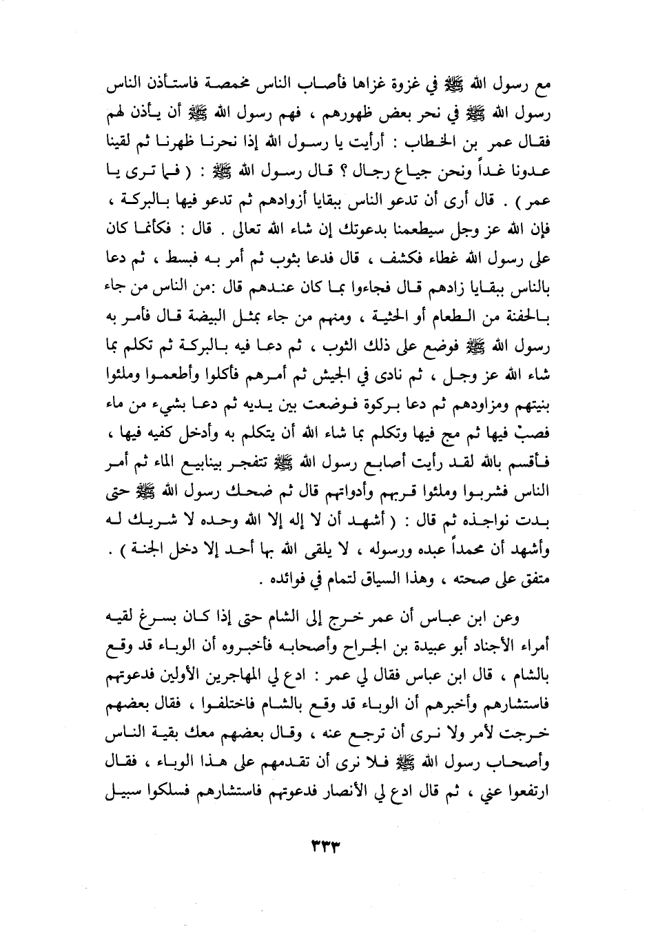 مع رسول الله -صلى الله عليه وسلم- في غزوة غزاها فأصاب الناس مخمصة فاستأذن الناس رسول الله -صلى الله عليه وسلم- في نحر بعض ظهورهم، فهم رسول الله -صلى الله عليه وسلم- أن يأذن لهم, فقال عمر بن الخطاب: أرأيت يا رسول الله إذا نحرنا ظهورنا ثم لقينا عدونا غدًا, ونحن جياع رجال? قال رسول الله -صلى الله عليه وسلم: "فما ترى يا عمر؟ " قال: أرى أن تدعو الناس ببقايا أزوادهم ثم تدعو فيها بالبركة، فإن الله -عز وجل- سيطعمنا بدعوتك إن شاء الله تعالى, قال: فكأنما كان على رسول الله غطاء فكشف، قال: فدعا بثوب ثم أمر به فبسط، ثم دعا بالناس ببقايا زادهم قال: فجاءوا بما كان عندهم قال: من الناس من جاء بالحفنة من الطعام أو الحثية، ومنهم من جاء بمثل البيضة قال: فأمر به رسول الله -صلى الله عليه وسلم- فوضع على ذلك الثوب، ثم دعا فيه بالبركة ثم تكلم بما شاء الله -عز وجل- ثم نادى في الجيش ثم أمرهم فأكلوا وأطعموا وملئوا بنيتهم ومزاودهم, ثم دعا بركوة فوضعت بين يديه ثم دعا بشيء من ماء فصب فيها ثم مج فيها وتكلم بما شاء الله أن يتكلم به وأدخل كفيه فيها، فأقسم بالله لقد رأيت أصابع رسول الله -صلى الله عليه وسلم- تتفجر بينابيع الماء, ثم أمر الناس فشربوا وملئوا قربهم وأدواتهم قال: ثم ضحك رسول الله -صلى الله عليه وسلم- حتى بدت نواجذه ثم قال: "أشهد أن لا إله إلا الله وحده لا شريك له, وأشهد أن محمدًا عبده ورسوله، لا يلقى الله بها أحد إلا دخل الجنة" متفق على صحته، وهذا السياق لتمام في فوائده.