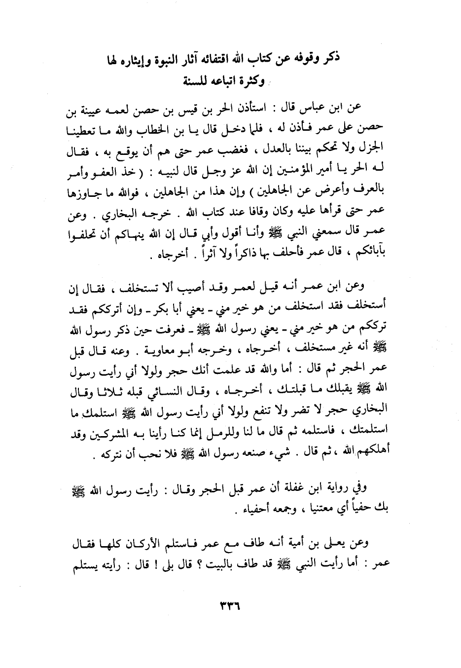 ذكر وقوفه عند كتاب الله, واقتفائه آثار النبوة وإيثاره لها, وكثرة اتباعه للسنة: