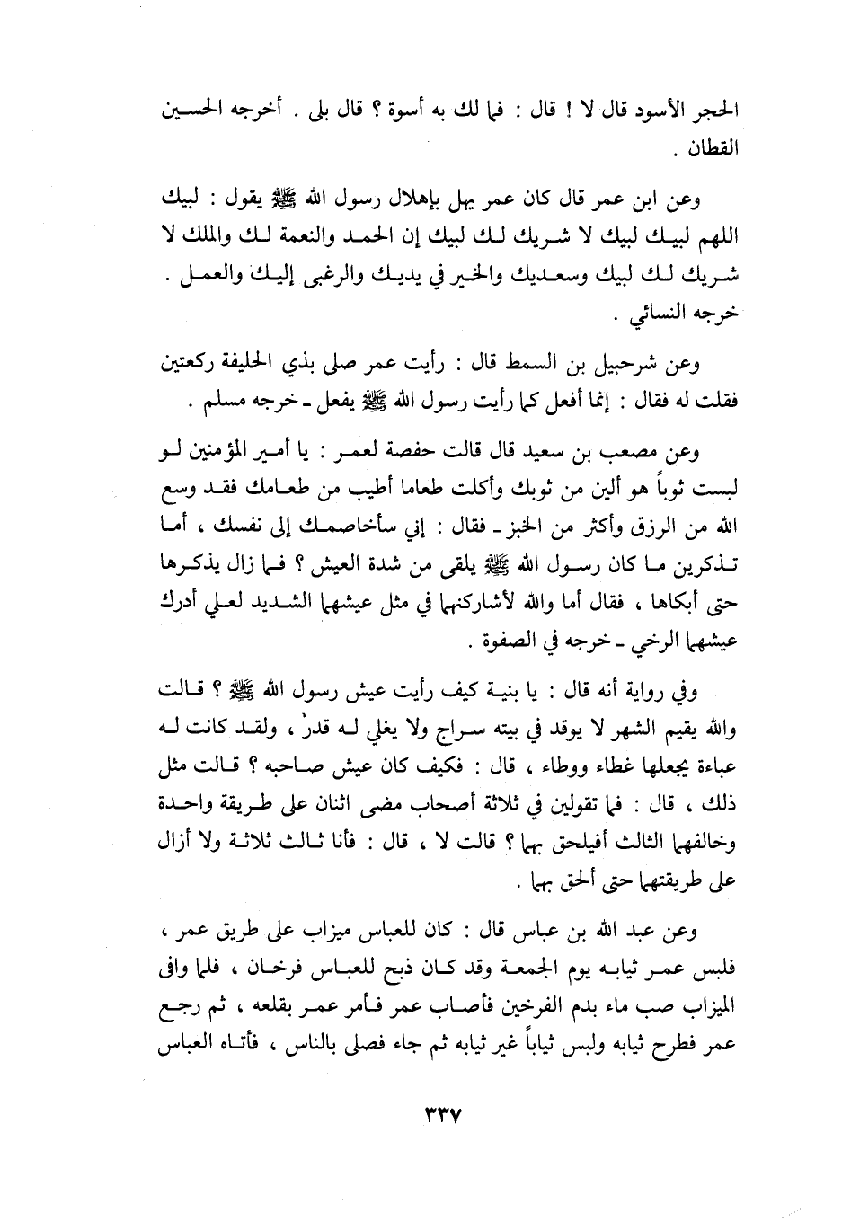 وعن ابن عمر قال: كان عمر يهلّ بإهلال رسول الله -صلى الله عليه وسلم- يقول: لبيك اللهم لبيك, لبيك لا شريك لك لبيك, إن الحمد والنعمة لك والملك, لا شريك لك, لبيك وسعديك والخير في يديك, والرغبى إليك والعمل. خرجه النسائي.