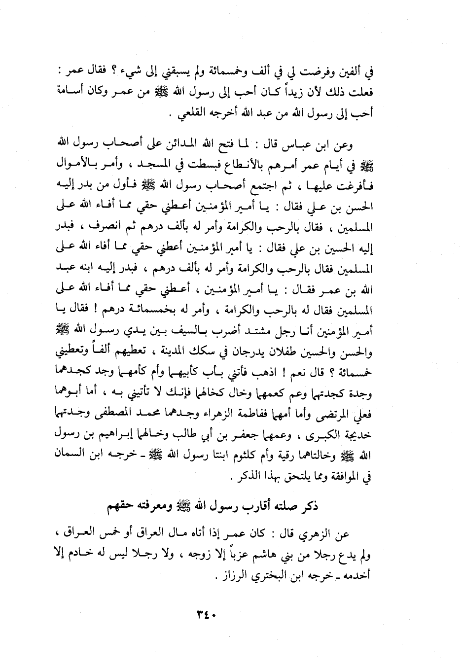 وعن ابن عباس قال: لما فتح الله المدائن على أصحاب رسول الله -صلى الله عليه وسلم- في أيام عمر أمرهم بالأنطاع فبسطت في المسجد، وأمر بالأموال فأفرغت عليها، ثم اجتمع أصحاب رسول الله -صلى الله عليه وسلم- فأول من بدر إليه الحسن بن علي فقال: يا أمير المؤمنين أعطني حقي مما أفاء الله على المسلمين، فقال: بالرحب والكرامة, وأمر له بألف درهم ثم انصرف، فبدر إليه الحسين بن علي فقال: يا أمير المؤمنين أعطني حقي مما أفاء الله على المسلمين فقال: بالرحب والكرامة وأمر له بألف درهم، فبدر إليه ابنه عبد الله بن عمر فقال: يا أمير المؤمنين، أعطني حقي مما أفاء الله على المسلمين فقال له: بالرحب والكرامة وأمر له بخمسمائة درهم, فقال: يا أمير المؤمنين أنا رجل مشتد, أضرب بالسيف بين يدي رسول الله -صلى الله عليه وسلم- والحسن والحسين طفلان يدرجان في سكك المدينة، تعطيهم ألفًا وتعطيني خمسمائة? قال: نعم, اذهب فأتني بأب كأبيهما وأم كأمهما وجد كجدهما وجدة كجدتهما وعم كعمهما وخال كخالهما فإنك لا تأتيني به، أما أبوهما فعلي المرتضى وأما أمهما ففاطمة الزهراء وجدهما محمد المصطفى وجدتهما خديجة الكبرى، وعمهما جعفر بن أبي طالب وخالهما إبراهيم ابن رسول الله -صلى الله عليه وسلم- وخالتاهما رقية وأم كلثوم ابنتا رسول الله -صلى الله عليه وسلم. خرجه ابن السمان في الموافقة ومما يلتحق بهذا الذكر: