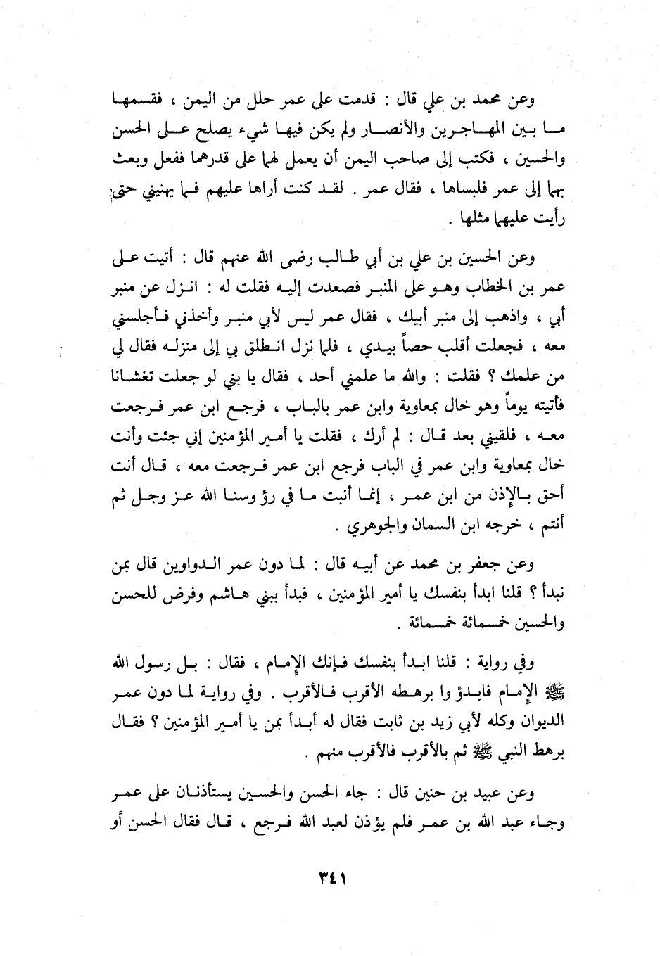 وعن محمد بن علي قال: قدمت على عمر حلل من اليمن، فقسمها ما بين المهاجرين والأنصار ولم يكن فيها شيء يصلح على الحسن والحسين، فكتب إلى صاحب اليمن أن يعمل لهما على قدرهما, ففعل وبعث بهما إلى عمر فلبساها، فقال عمر: لقد كنت أراها عليهم, فما يهنيني حتى رأيت عليهما مثلها.
