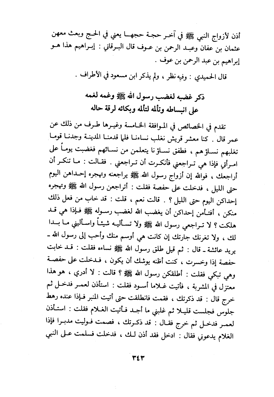 تقدم في الخصائص في الموافقة الخامسة وغيرها طرف من ذلك عن عمر قال: كنا معشر قريش نغلب نساءنا, فلما قدمنا المدينة وجدنا قومًا تغلبهم نساؤهم، فطفق نساؤنا يتعلمن من نسائهم فغضبت يومًا على امرأتي فإذا هي تراجعني فأنكرت أن تراجعني, فقالت: ما تنكر أن أراجعك، فوالله إن أزواج رسول الله -صلى الله عليه وسلم- يراجعنه وتهجره إحداهن اليوم حتى الليل، فدخلت على حفصة فقلت: أتراجعن رسول الله -صلى الله عليه وسلم- وتهجره إحداكن اليوم حتى الليل? قالت: نعم، قلت: قد خاب من فعل ذلك منكن، أفتأمن إحداكن أن يغضب الله لغضب رسوله -صلى الله عليه وسلم- فإذا هي قد هلكت, لا تراجعي رسول الله -صلى الله عليه وسلم- ولا تسأليه شيئًا واسأليني ما بدا لك، ولا تغرنك جارتك إن كانت هي أوسم منك وأحب إلى رسول الله -يريد عائشة- قال: ثم قيل: طلق رسول الله -صلى الله عليه وسلم- نساءه فقلت: قد خابت حفصة إذًا وخسرت، كنت أظنه يوشك أن يكون، فدخلت على حفصة وهي تبكي فقلت: أطلقكن رسول الله -صلى الله عليه وسلم? قالت: لا أدري، هو ذا معتزل في المشربة، فأتيت غلامًا أسود فقلت: استأذن لعمر, فدخل ثم خرج قال: قد ذكرتك، فقمت فانطلقت حتى أتيت المنبر فإذا عنده رهط جلوس فجلست قليلًا ثم غلبني ما أجد فأتيت الغلام فقلت: استأذن لعمر فدخل ثم خرج فقال: قد ذكرتك، فصمت فوليت مدبرًا فإذا الغلام يدعوني فقال: ادخل فقد أذن لك، فدخلت فسلمت على النبي