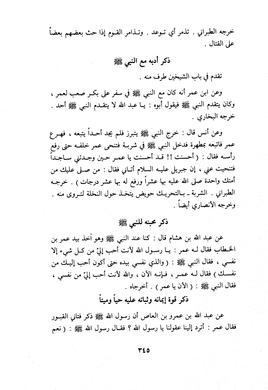 عن عبد الله بن هشام قال: كنا عند النبي -صلى الله عليه وسلم- وهو آخذ بيد عمر بن الخطاب فقال له عمر: يا رسول الله, لأنت أحب إليَّ من كل شيء إلا نفسي، فقال النبي -صلى الله عليه وسلم: "والذي نفسي بيده, حتى أكون أحب إليك من نفسك" فقال له عمر: فإنه الآن، والله لأنت أحب إليَّ من نفسي، فقال النبي -صلى الله عليه وسلم: "الآن يا عمر". أخرجاه.