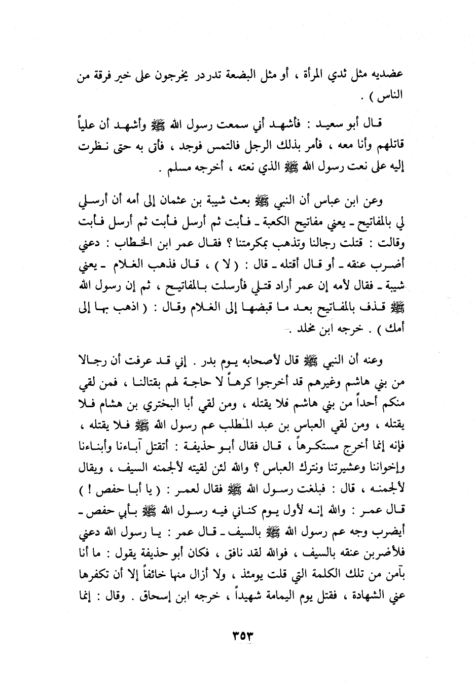 وعنه أن النبي -صلى الله عليه وسلم- قال لأصحابه يوم بدر: "إني قد عرفت أن رجالًا من بني هاشم وغيرهم قد أخرجوا كرهًا لا حاجة لهم بقتالنا، فمن لقي منكم أحدًا من بني هاشم فلا يقتله، ومن لقي أبا البختري بن هشام فلا يقتله، ومن لقي العباس بن عبد المطلب عم رسول الله -صلى الله عليه وسلم- فلا يقتله, فإنه إنما أخرج مستكرهًا" قال: فقال أبو حذيفة: أنقتل آباءنا وأبناءنا وإخواننا وعشيرتنا, ونترك العباس? والله لئن لقيته لألجمنه السيف، ويقال: لألجمنه، قال: فبلغت رسول الله -صلى الله عليه وسلم- فقال لعمر: "يا أبا حفص" قال عمر: والله إنه لأول يوم كناني فيه رسول الله -صلى الله عليه وسلم- بأبي حفص, أيضرب وجه عم رسول الله -صلى الله عليه وسلم- بالسيف؟ قال عمر: يا رسول الله دعني فلأضربن عنقه بالسيف، فوالله لقد نافق، فكان أبو حذيفة يقول: ما أنا بآمن من تلك الكلمة التي قلت يومئذ، ولا أزال منها خائفًا إلا أن تكفرها عني الشهادة، فقتل يوم اليمامة شهيدًا. خرجه ابن إسحاق, وقال: إنما
