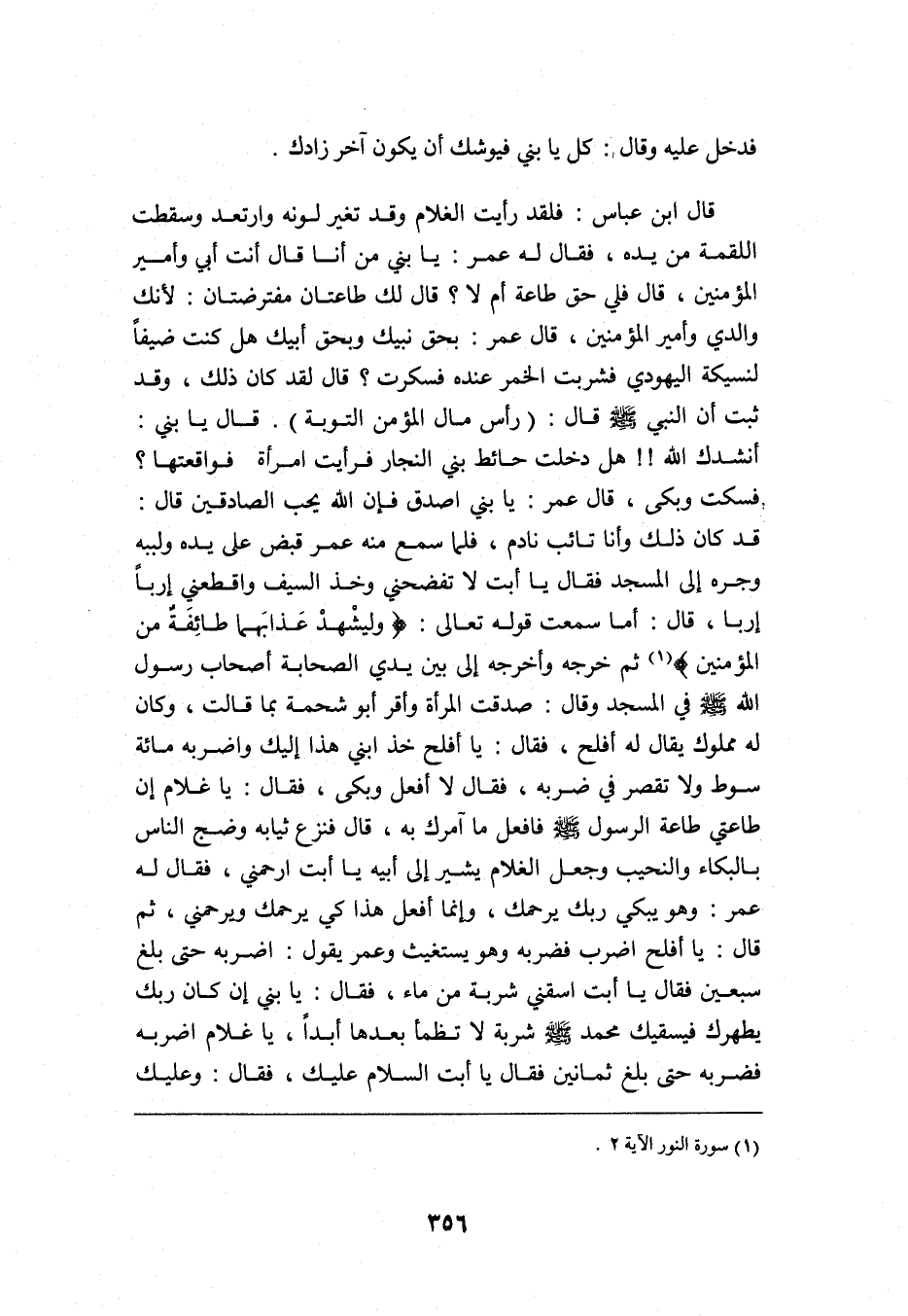 قال ابن عباس: فلقد رأيت الغلام وقد تغير لونه وارتعد وسقطت اللقمة من يده، فقال له عمر: يا بني من أنا؟ قال: أنت أبي وأمير المؤمنين، قال: فلي حق طاعة أم لا? قال: لك طاعتان مفترضتان؛ لأنك والدي وأمير المؤمنين، قال عمر: بحق نبيك وبحق أبيك هل كنت ضيفًا لنسيكة اليهودي, فشربت الخمر عنده فسكرت? قال: لقد كان ذلك، وقد ثبت أن النبي -صلى الله عليه وسلم- قال: "رأس مال المؤمن التوبة" قال: يا بني, أنشدك الله هل دخلت حائط بني النجار فرأيت امرأة فواقعتها? فسكت وبكى، قال عمر: يا بني اصدق فإن الله يحب الصادقين قال: قد كان ذلك وأنا تائب نادم، فلما سمع منه عمر قبض على يده ولببه وجره إلى المسجد فقال: يا أبت لا تفضحني وخذ السيف واقطعني إربًا إربًا، قال: أما سمعت قوله تعالى: {وَلْيَشْهَدْ عَذَابَهُمَا طَائِفَةٌ مِنَ الْمُؤْمِنِينَ} 1 ثم خرجه وأخرجه إلى بين يدي الصحابة أصحاب رسول الله -صلى الله عليه وسلم- في المسجد وقال: صدقت المرأة وأقر أبو شحمة بما قالت، وكان له مملوك يقال له: أفلح، فقال: يا أفلح, خذ ابني هذا إليك واضربه مائة سوط ولا تقصر في ضربه، فقال: لا أفعل وبكى، فقال: يا غلام إن طاعتي طاعة الرسول -صلى الله عليه وسلم- فافعل ما آمرك به، قال: فنزع ثيابه وضج الناس بالبكاء والنحيب وجعل الغلام يشير إلى أبيه: يا أبت ارحمني، فقال له عمر وهو يبكي: ربك يرحمك، وإنما أفعل هذا كي يرحمك ويرحمني، ثم قال: يا أفلح اضرب, فضربه وهو يستغيث وعمر يقول: اضربه حتى بلغ سبعين فقال: يا أبت اسقني شربة من ماء، فقال: يا بني إن كان ربك يطهرك فيسقيك محمد -صلى الله عليه وسلم- شربة لا تظمأ بعدها أبدًا، يا غلام اضربه, فضربه حتى بلغ ثمانين فقال: يا أبت السلام عليك، فقال: وعليك