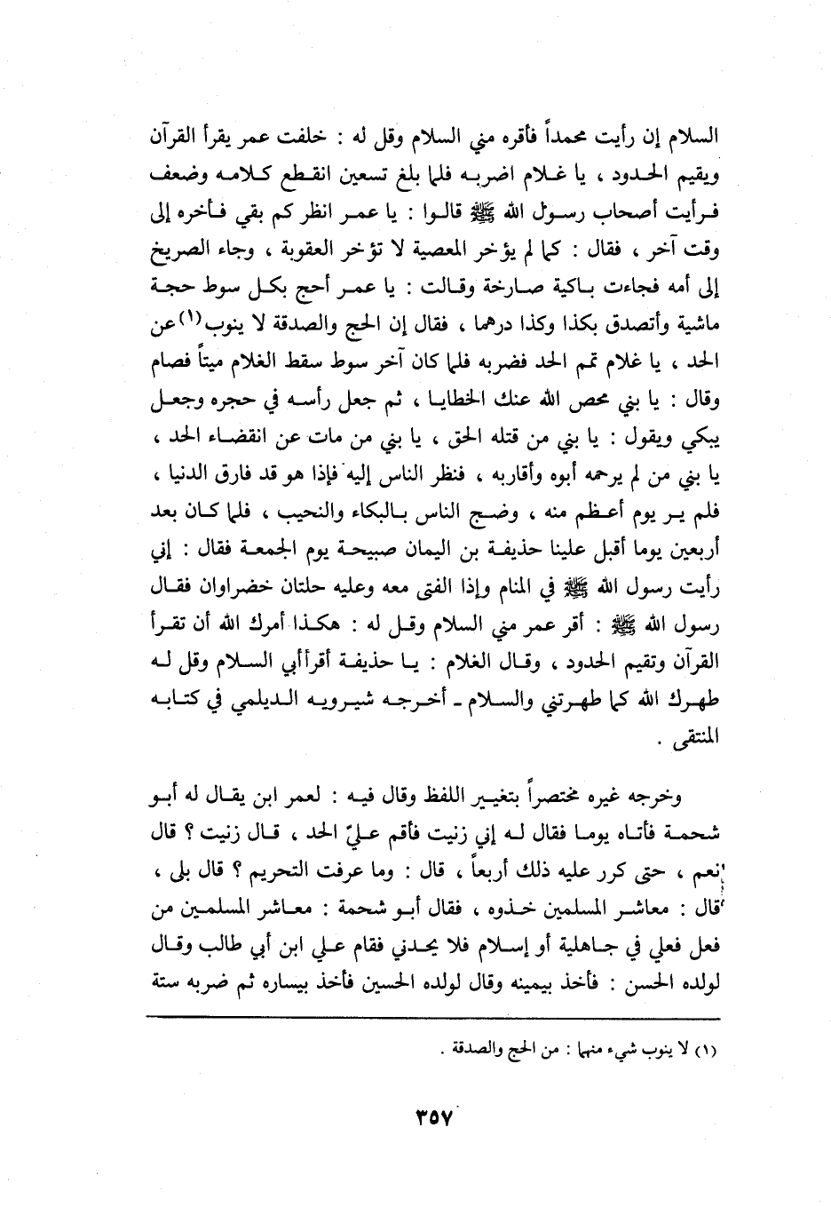 السلام إن رأيت محمدًا فأقرئه مني السلام وقل له: خلفت عمر يقرأ القرآن ويقيم الحدود، يا غلام اضربه فلما بلغ تسعين انقطع كلامه وضعف, فرأيت أصحاب رسول الله -صلى الله عليه وسلم- قالوا: يا عمر انظر كم بقي فأخره إلى وقت آخر، فقال: كما لم تؤخر المعصية لا تؤخر العقوبة، وجاء الصريخ إلى مه فجاءت باكية صارخة وقالت: يا عمر أحج بكل سوط حجة ماشية وأتصدق بكذا وكذا درهما، فقال: إن الحج والصدقة لا ينوب1 عن الحد، يا غلام تمم الحد فضربه, فلما كان آخر سوط سقط الغلام ميتًا فصام وقال: يا بني محص الله عنك الخطايا، ثم جعل رأسه في حجره وجعل يبكي ويقول: يا بني من قتله الحق، يا بني من مات عن انقضاء الحد، يا بني من لم يرحمه أبوه وأقاربه، فنظر الناس إليه فإذا هو قد فارق الدنيا، فلم ير يوم أعظم منه، وضج الناس بالبكاء والنحيب، فلما كان بعد أربعين يومًا أقبل علينا حذيفة بن اليمان صبيحة يوم الجمعة فقال: إني رأيت رسول الله -صلى الله عليه وسلم- في المنام وإذ الفتى معه وعليه حلتان خضراوان فقال رسول الله -صلى الله عليه وسلم: "أقرئ عمر مني السلام وقل له: هكذا أمرك الله أن تقرأ القرآن وتقيم الحدود" وقال الغلام: يا حذيفة, أقرئ أبي السلام وقل له: طهرك الله كما طهرتني والسلام. أخرجه شيرويه الديلمي في كتابه المنتقى.
