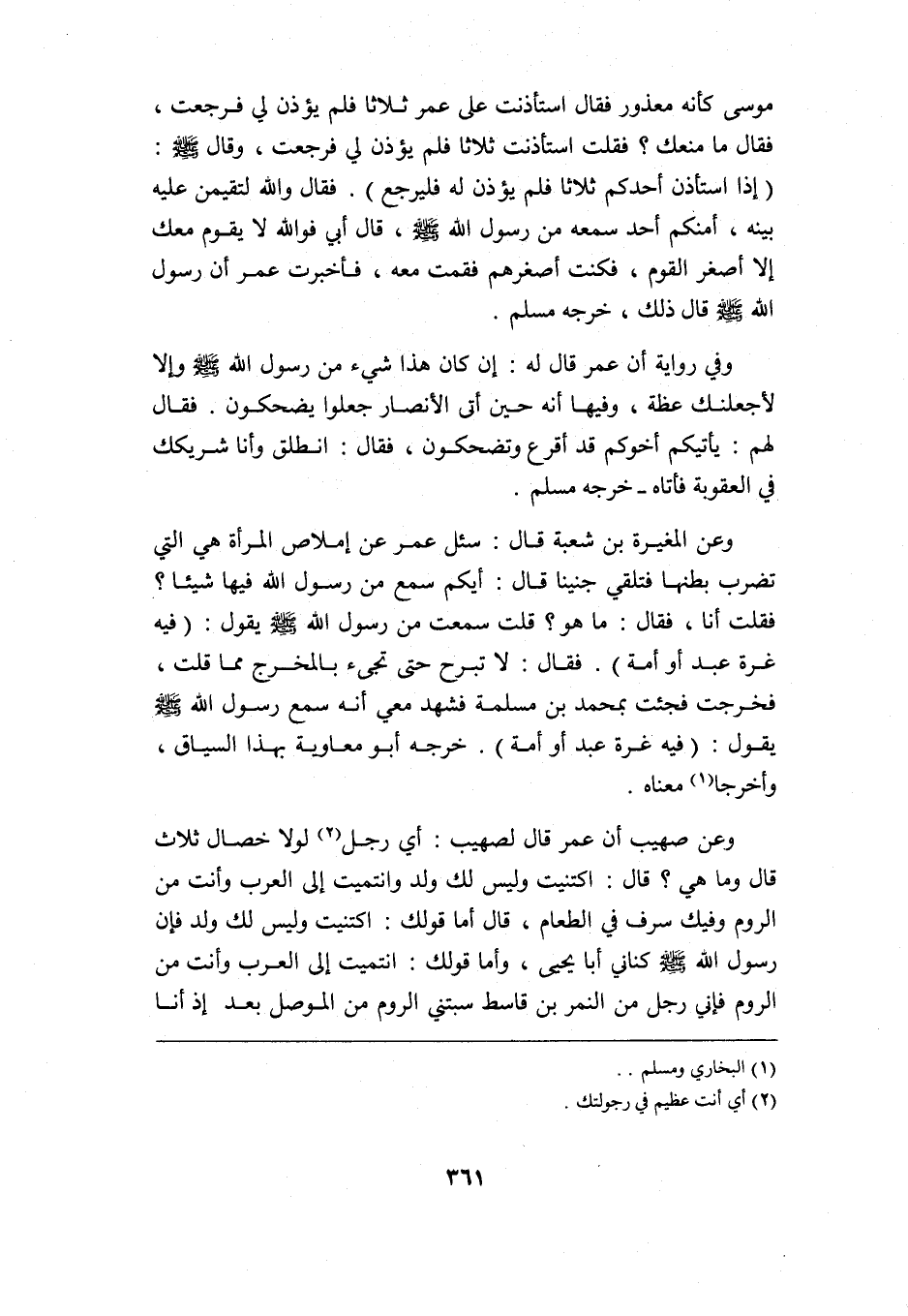موسى كأنه معذور فقال: استأذنت على عمر ثلاثًا فلم يؤذن لي فرجعت، فقال: ما منعك? فقلت: استأذنت ثلاثًا فلم يؤذن لي فرجعت، وقال صلى الله عليه وسلم: "إذا استأذن أحدكم ثلاثًا فلم يؤذن له, فليرجع" فقال: والله لتقيمن عليه بينة، أمنكم أحد سمعه من رسول الله -صلى الله عليه وسلم؟ قال أبي: فوالله لا يقوم معك إلا أصغر القوم، فكنت أصغرهم فقمت معه، فأخبرت عمر أن رسول الله -صلى الله عليه وسلم- قال ذلك، خرجه مسلم.