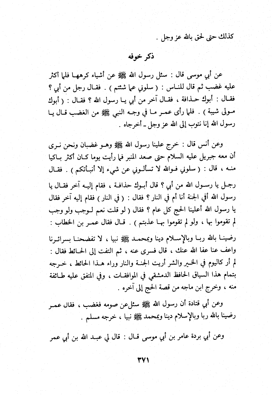 وعن أنس قال: خرج علينا رسول الله -صلى الله عليه وسلم- وهو غضبان ونحن نرى أن معه جبريل -عليه السلام- حتى صعد المنبر فما رأيت يومًا كان أكثر باكيًا منه، قال: "سلوني, فوالله لا تسألونني عن شيء إلا أنبأتكم" فقال رجل: يا رسول الله من أبي? قال: "أبوك حذافة" فقام إليه آخر فقال: يا رسول الله أفي الجنة أنا أم في النار? فقال: "في النار" فقام إليه آخر فقال: يا رسول الله أعلينا الحج كل عام? فقال: "لو قلت نعم لوجب ولو وجب لم تقوموا بها، ولو لم تقوموا بها عذبتم" قال: فقال عمر بن الخطاب: رضينا بالله ربًّا وبالإسلام دينًا وبمحمد -صلى الله عليه وسلم- نبيًّا، لا تفضحنا بسرائرنا واعف عنا عفا الله عنك، قال: فسري عنه، ثم التفت إلى الحائط فقال: "لم أر كاليوم في الخير والشر, أريت الجنة والنار وراء هذا الحائط". خرجه بتمام هذا السياق الحافظ الدمشقي في الموافقات، وفي المتفق عليه طائفة منه، وخرج ابن ماجه من قصة الحج إلى آخره.