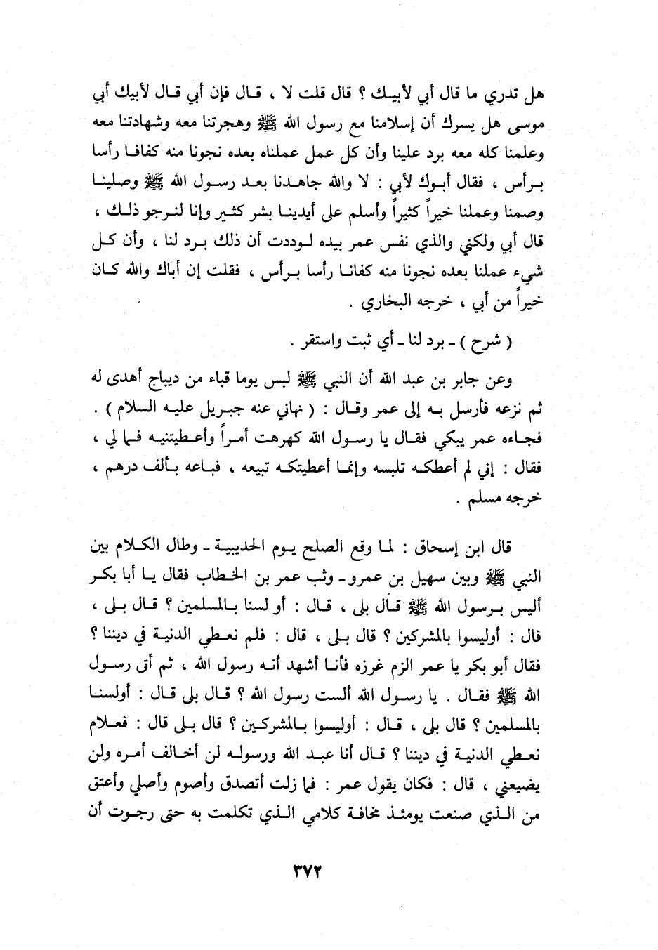 قال ابن إسحاق: لما وقع الصلح يوم الحديبية وطال الكلام بين النبي -صلى الله عليه وسلم- وبين سهيل بن عمرو, وثب عمر بن الخطاب فقال: يا أبا بكر أليس برسول الله -صلى الله عليه وسلم؟ قال: بلى، قال: أولسنا بالمسلمين? قال: بلى، قال: أوليسوا بالمشركين? قال: بلى، قال: فلم نعطى الدنية في ديننا? فقال أبو بكر: يا عمر الزم غرزه, فأنا أشهد أنه رسول الله، ثم أتى رسول الله -صلى الله عليه وسلم- فقال: يا رسول الله ألست رسول الله? قال: "بلى" قال: أولسنا بالمسلمين? قال: "بلى" قال: أوليسوا بالمشركين? قال: "بلى" قال: فعلام نعطى الدنية في ديننا? قال: "أنا عبد الله ورسوله, لن أخالف أمره ولن يضيعني" قال: فكان يقول عمر: فما زلت أتصدق وأصوم وأصلي وأعتق من الذي صنعت يومئذ مخافة كلامي الذي تكلمت به, حتى رجوت أن