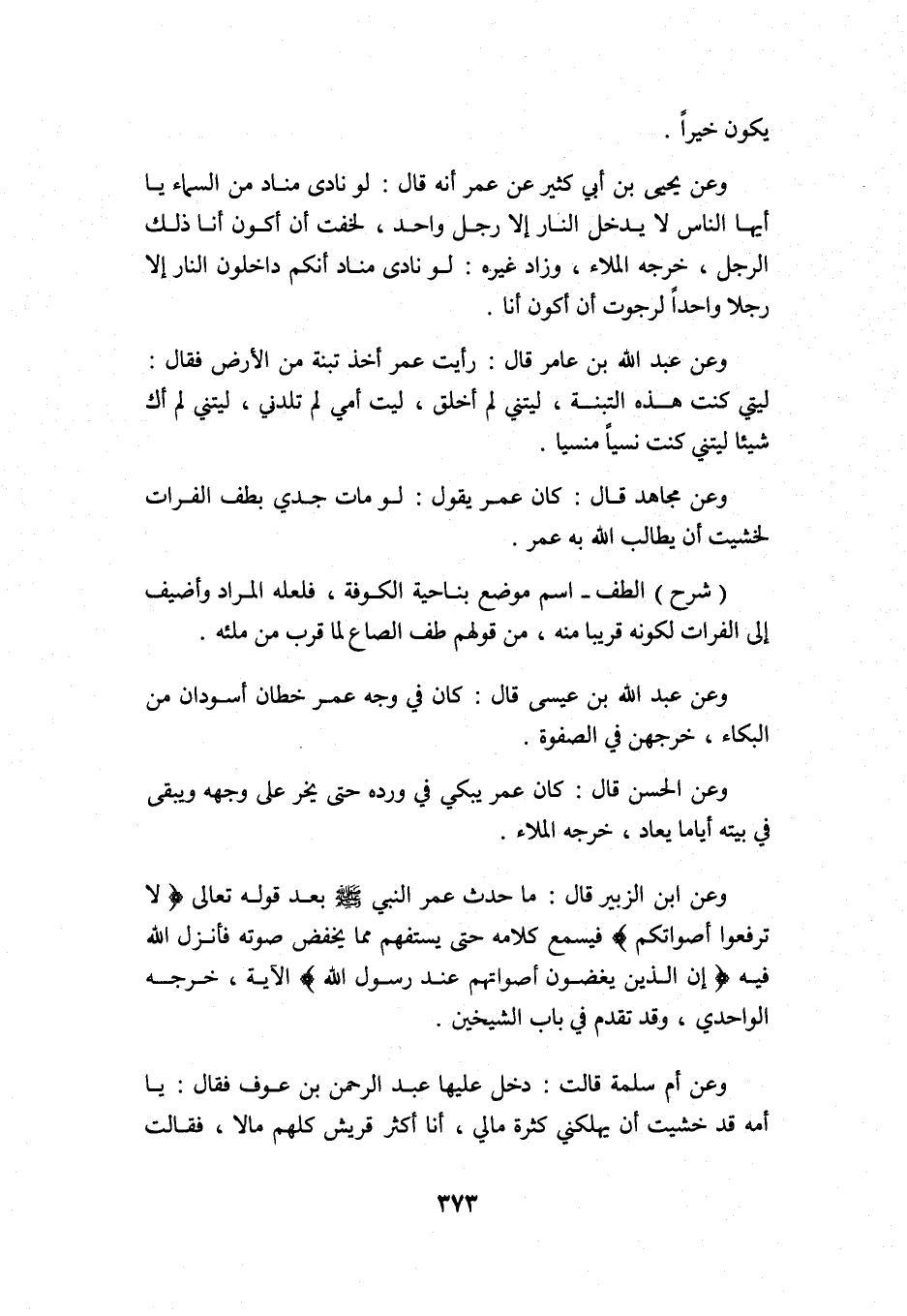 وعن يحيى بن أبي كثير عن عمر أنه قال: لو نادى مناد من السماء: يا أيها الناس لا يدخل النار إلا رجل واحد، لخفت أن أكون أنا ذلك الرجل. خرجه الملاء، وزاد غيره: لو نادى مناد: إنكم داخلون النار إلا رجلًا واحدا, لرجوت أن أكون أنا.