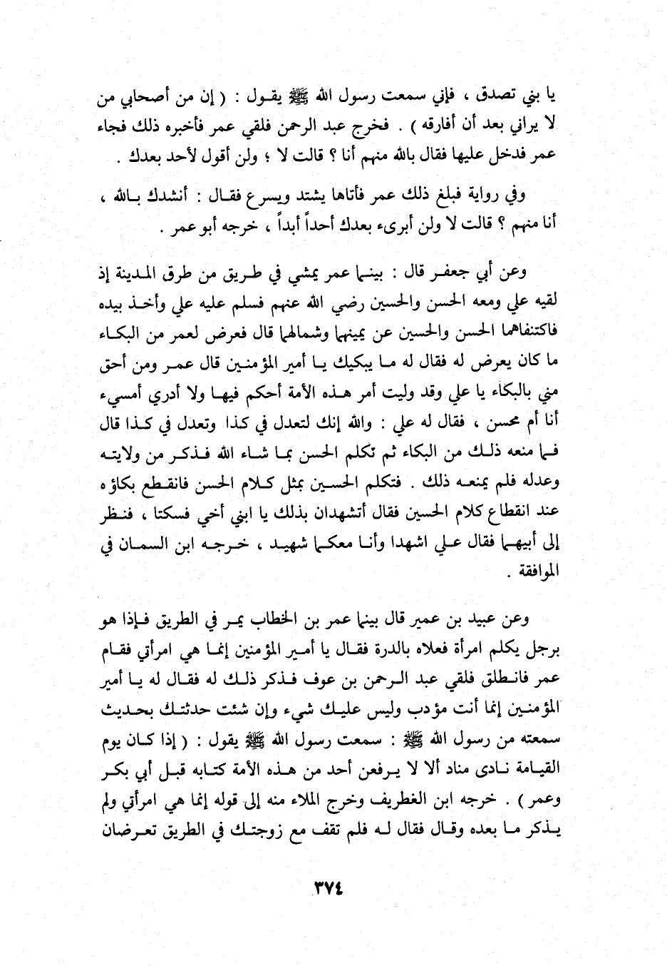 وعن أبي جعفر قال: بينما عمر يمشي في طريق من طرق المدينة إذ لقيه علي ومعه الحسن والحسين -رضي الله عنهم- فسلم عليه علي وأخذ بيده, فاكتنفهما الحسن والحسين عن يمينهما وشمالهما قال: فعرض لعمر من البكاء ما كان يعرض له فقال له: ما يبكيك يا أمير المؤمنين؟ قال عمر: ومن أحق مني بالبكاء يا علي؟ وقد وليت أمر هذه الأمة أحكم فيها ولا أدري أمسيء أنا أم محسن، فقال له علي: والله إنك لتعدل في كذا وتعدل في كذا قال: فما منعه ذلك من البكاء, ثم تكلم الحسن بما شاء الله فذكر من ولايته وعدله فلم يمنعه ذلك, فتكلم الحسين بمثل كلام الحسن فانقطع بكاؤه عند انقطاع كلام الحسين, فقال: أتشهدان بذلك يابني أخي؟ فسكتا، فنظر إلى أبيهما فقال علي: اشهدا وأنا معكما شهيد، خرجه ابن السمان في الموافقة.