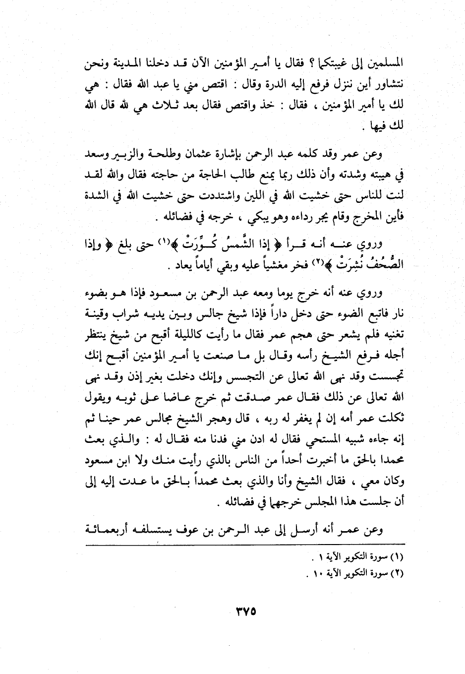 المسلمين إلى غيبتكما? فقال: يا أمير المؤمنين الآن قد دخلنا المدينة ونحن نتشاور أين ننزل؟ فرفع إليه الدرة وقال: اقتص مني يا عبد الله فقال: هي لك يا أمير المؤمنين، فقال: خذ واقتص فقال بعد ثلاث: هي لله, قال الله لك فيها.
