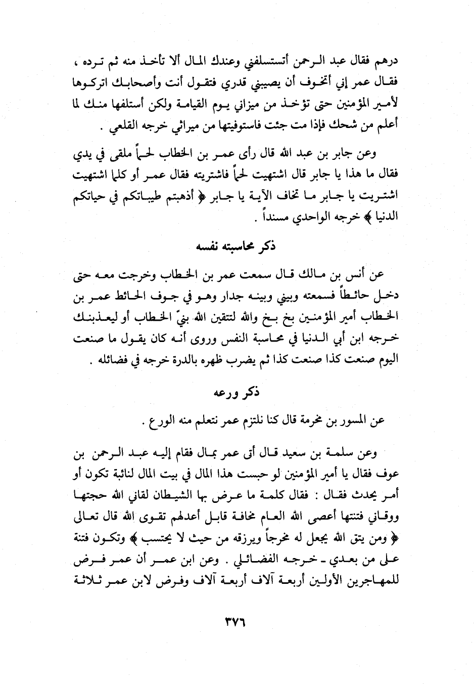 عن أنس بن مالك قال: سمعت عمر بن الخطاب وخرجت معه حتى دخل حائطًا فسمعته وبيني وبينه جدار وهو في جوف الحائط: عمر بن الخطاب أمير المؤمنين بخ بخ, والله لتتقين الله بني الخطاب أو ليعذبنك, خرجه ابن أبي الدنيا في محاسبة النفس, وروى أنه كان يقول: ما صنعت اليوم؟ صنعت كذا صنعت كذا, ثم يضرب ظهره بالدرة, خرجه في فضائله.