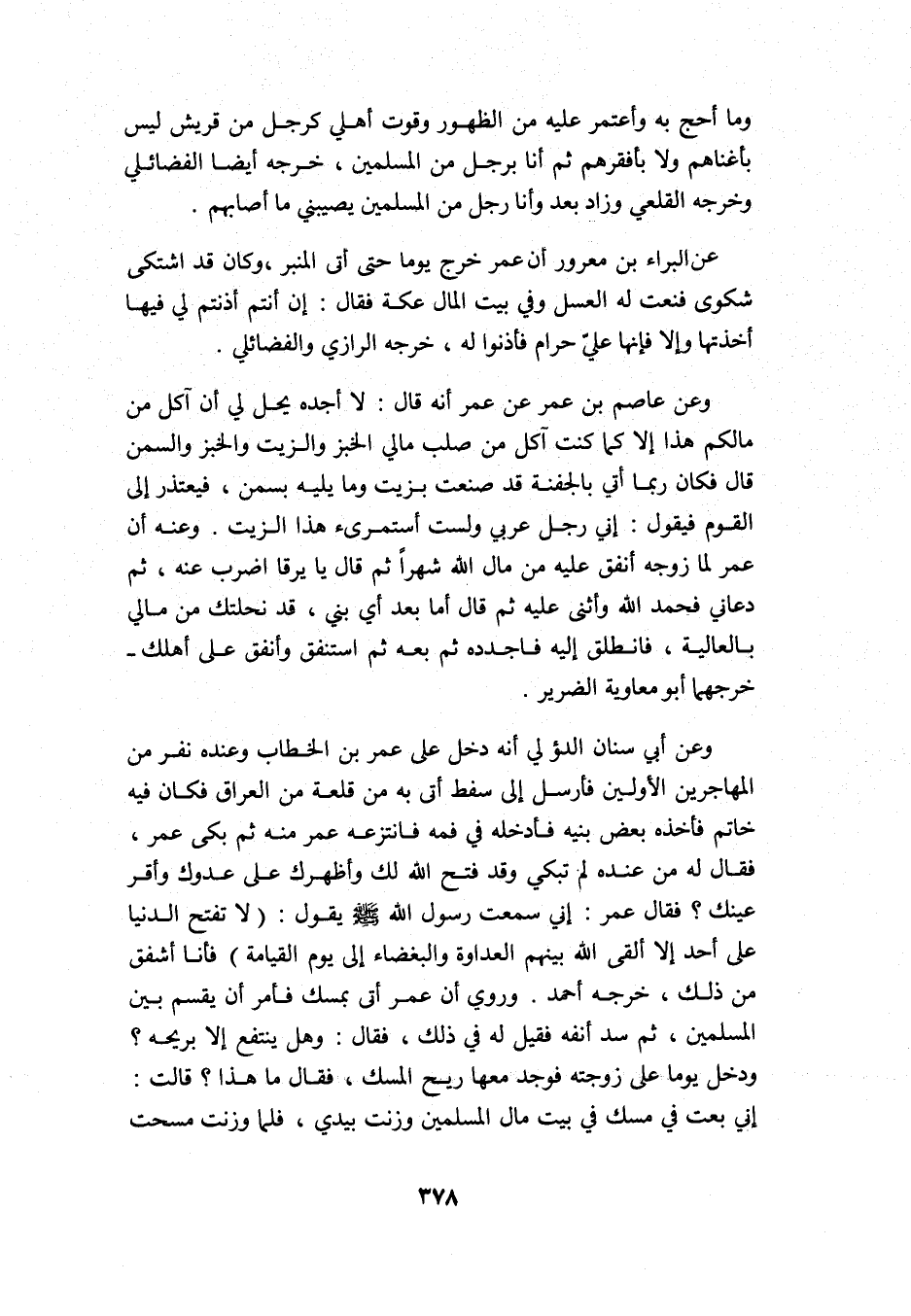وعن عاصم بن عمر عن عمر أنه قال: لا أجده يحل لي أن آكل من مالكم هذا إلا كما كنت آكل من صلب مالي الخبز والزيت, والخبز والسمن قال: فكان ربما أتي بالحفنة قد صنعت بزيت وما يليه بسمن، فيعتذر إلى القوم فيقول: إني رجل عربي ولست أستمرئ هذا الزيت. وعنه أن عمر لما زوجه أنفق عليه من مال الله شهرًا ثم قال: يا يرفأ اضرب عنه، ثم دعاني فحمد الله وأثنى عليه ثم قال: أما بعد أي بني، قد نحلتك من مالي بالعالية، فانطلق إليه فأجدده ثم بعه ثم استنفق وأنفق على أهلك، خرجهما أبو معاوية الضرير.