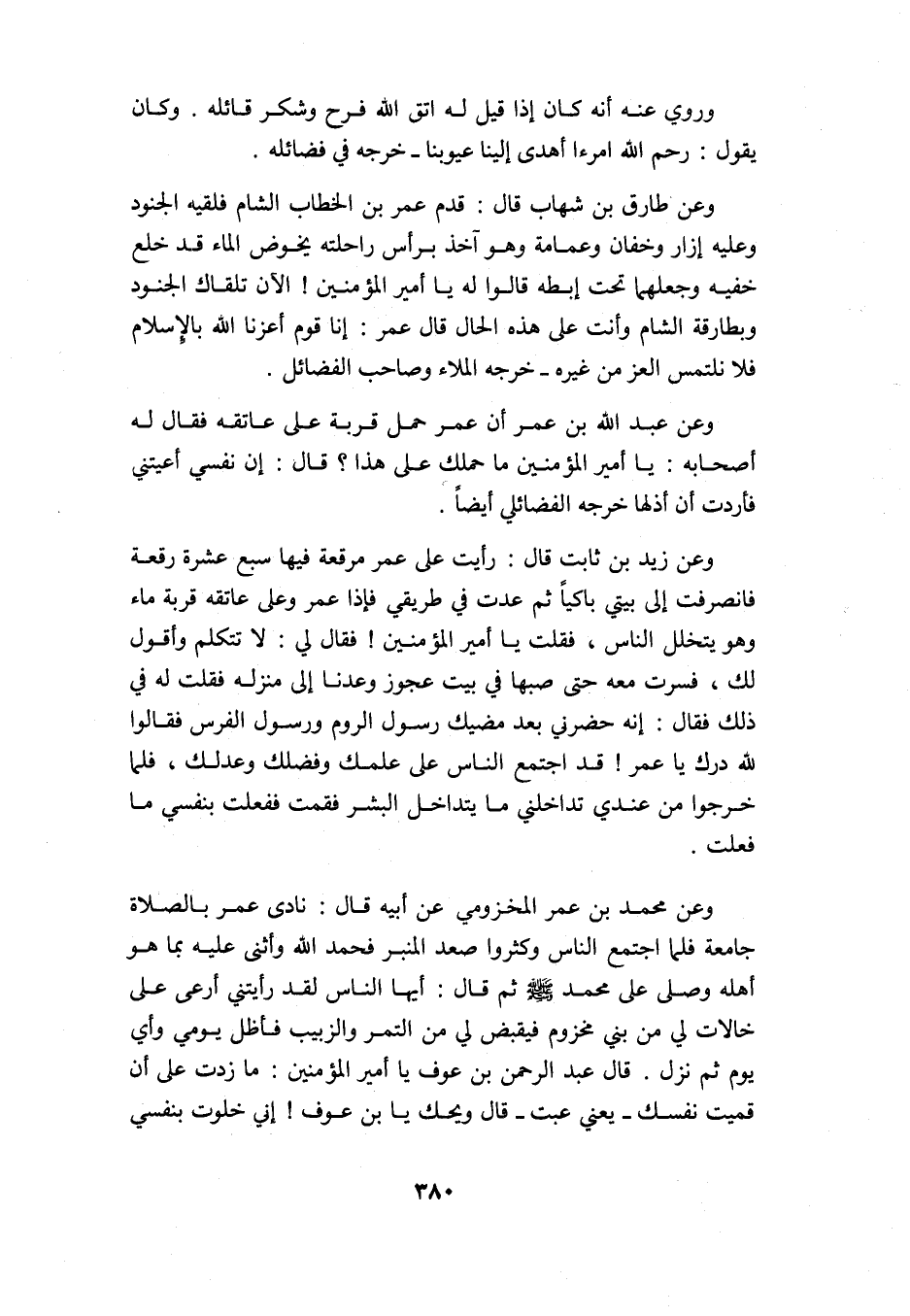 وعن طارق بن شهاب قال: قدم عمر بن الخطاب الشام فلقيه الجنود وعليه إزار وخفان وعمامة وهو آخذ برأس راحلته يخوض الماء قد خلع خفيه, وجعلهما تحت إبطه قالوا له: يا أمير المؤمنين, الآن تلقاك الجنود وبطارقة الشام وأنت على هذه الحال؟! قال عمر: إنا قوم أعزنا الله بالإسلام, فلا نلتمس العز من غيره, خرجه الملاء وصاحب الفضائل.