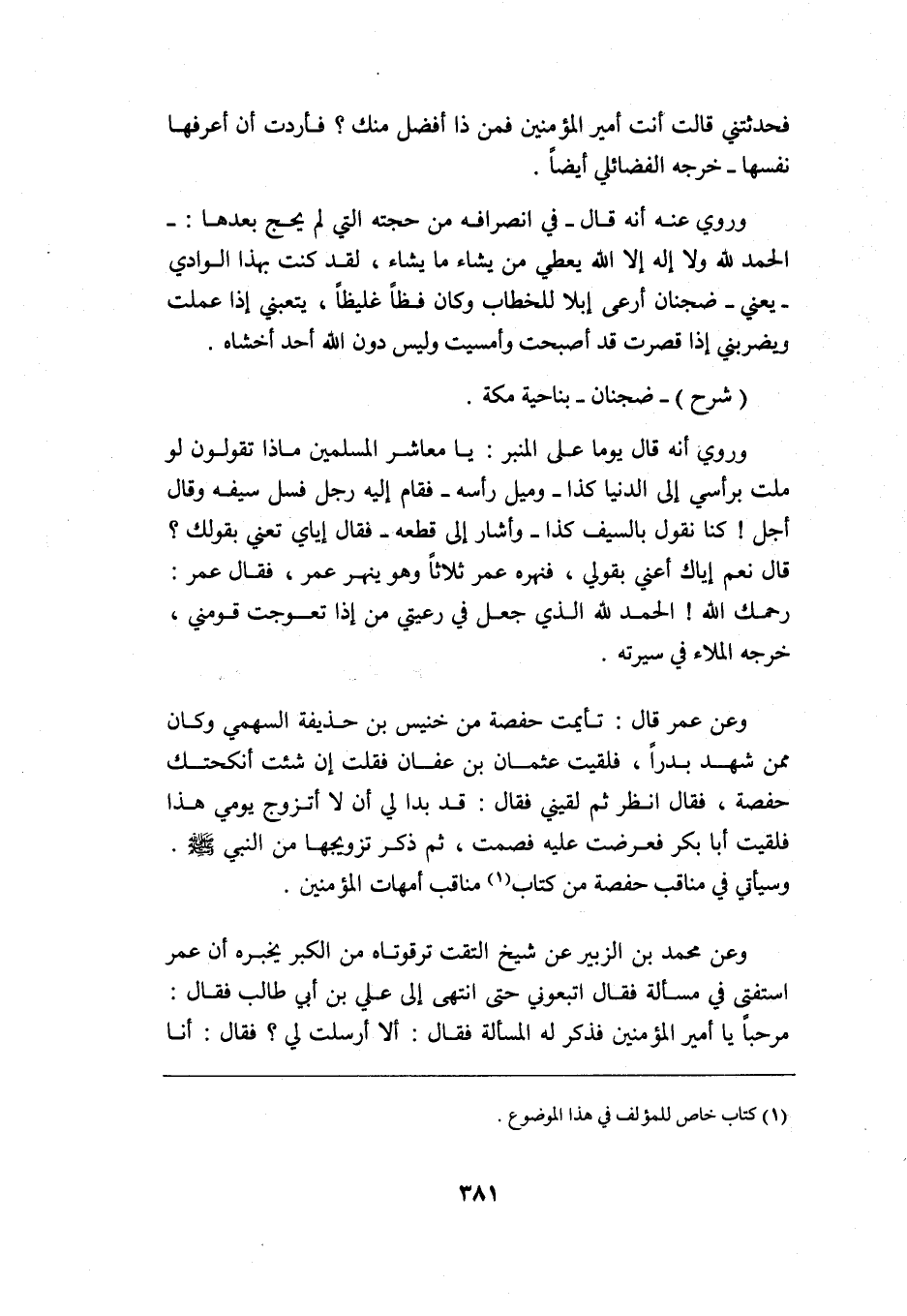 وعن عمر قال: تأيمت حفصة من خنيس بن حذيفة السهمي وكان ممن شهد بدرًا، فلقيت عثمان بن عفان فقلت: إن شئت أنكحتك حفصة، فقال: أنظر ثم لقيني فقال: قد بدا لي أن لا أتزوج يومي هذا, فلقيت أبا بكر فعرضت عليه فصمت، ثم ذكر تزويجها من النبي -صلى الله عليه وسلم- وسيأتي في مناقب حفصة من كتاب1 مناقب أمهات المؤمنين.
