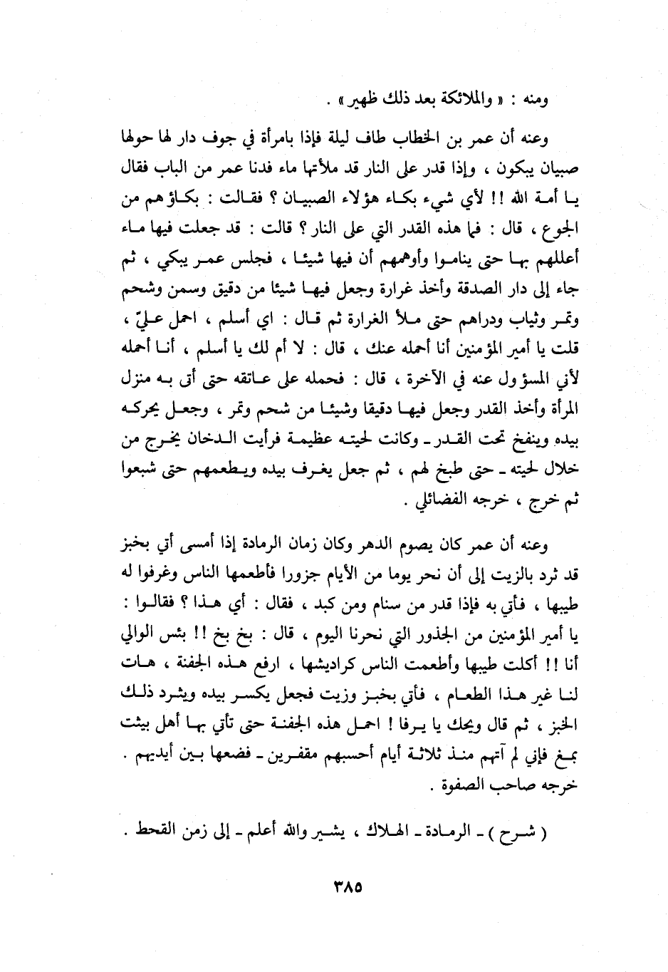 وعنه أن عمر كان يصوم الدهر وكان زمان الرمادة إذا أمسى أتي بخبز قد ثرد بالزيت إلى أن نحر يومًا من الأيام جزورًا فأطعمها الناس وغرفوا له طيبها، فأتي به فإذا قدر من سنام ومن كبد، فقال: أي هذا? فقالوا: يا أمير المؤمنين من الجزور التي نحرنا اليوم، قال: بخ بخ!! بئس الوالي أنا!! أكلت طيبها وأطعمت الناس كراديسها، ارفع هذه الجفنة، هات لنا غير هذا الطعام، فأتي بخبز وزيت فجعل يكسر بيده ويثرد ذلك الخبز، ثم قال: ويحك يا يرفأ! احمل هذه الجفنة حتى تأتي بها أهل بيت بتمغ, فإني لم آتهم منذ ثلاثة أيام أحسبهم مقفرين، فضعها بين أيديهم. خرجه صاحب الصفوة.