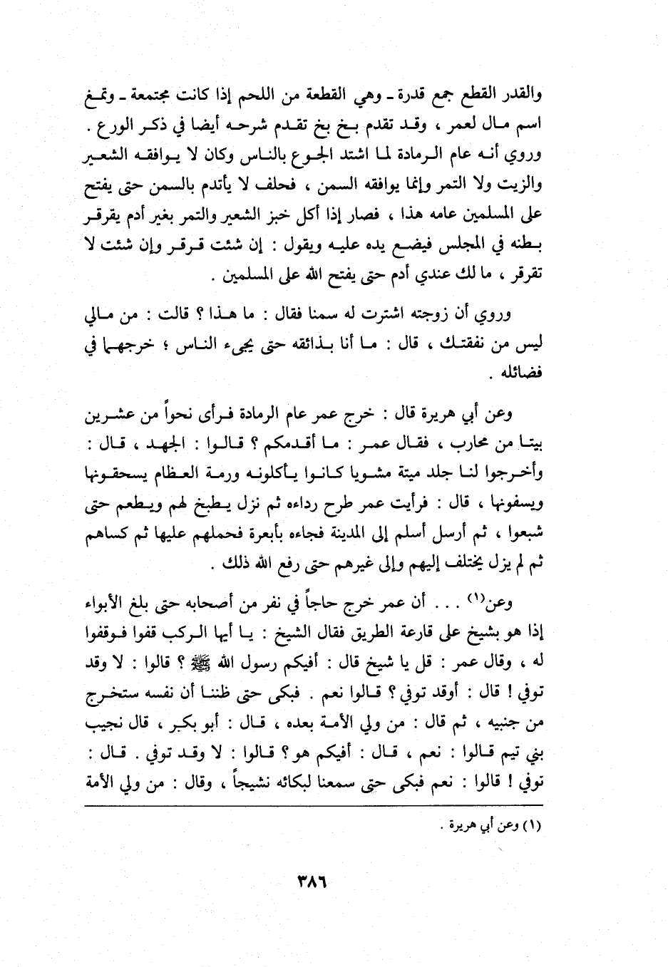 وعن أبي هريرة قال: خرج عمر عام الرمادة فرأى نحوًا من عشرين بيتًا من محارب، فقال عمر: ما أقدمكم? قالوا: الجهد، قال: وأخرجوا لنا جلد ميتة مشويا كانوا يأكلونه ورمة العظام يسحقونها ويسفونها، قال: فرأيت عمر طرح رداءه ثم نزل يطبخ لهم ويطعم حتى شبعوا، ثم أرسل أسلم إلى المدينة فجاءه بأبعرة, فحملهم عليها ثم كساهم, ثم لم يزل يختلف إليهم وإلى غيرهم حتى رفع الله ذلك.