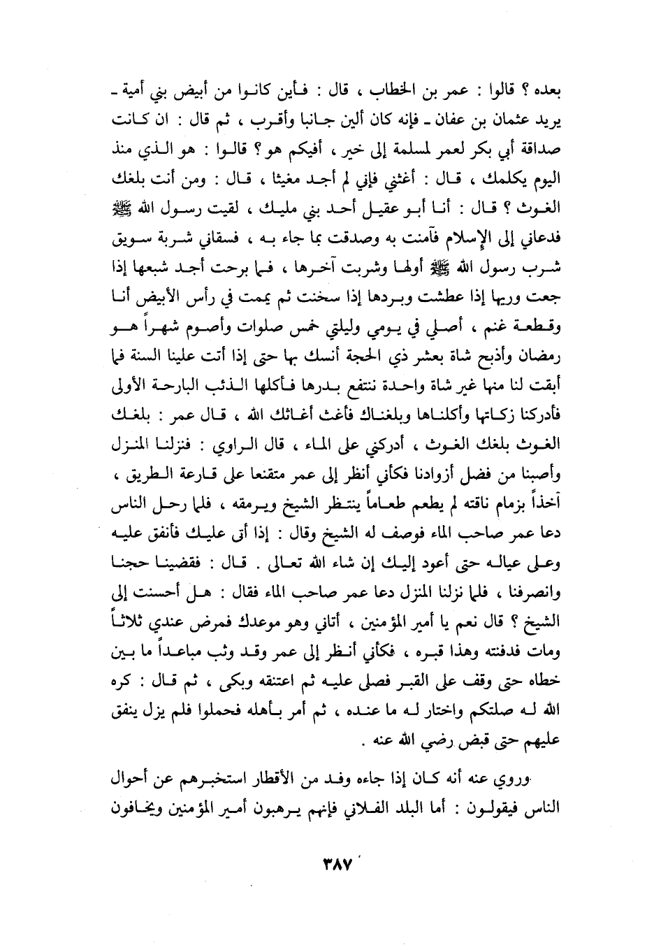 بعده? قالوا: عمر بن الخطاب، قال: فأين كانوا من أبيض بني أمية -يريد عثمان بن عفان- فإنه كان ألين جانبًا وأقرب؟! ثم قال: إن كانت صداقة أبي بكر لعمر لمسلمة إلى خير، أفيكم هو? قالوا: هو الذي منذ اليوم يكلمك، قال: أغثني, فإني لم أجد مغيثًا، قال: ومن أنت بلغك الغوث? قال: أنا أبو عقيل أحد بني مليك، لقيت رسول الله -صلى الله عليه وسلم- فدعاني إلى الإسلام فآمنت به وصدقت بما جاء به، فسقاني شربة سويق شرب رسول الله -صلى الله عليه وسلم- أولها وشربت آخرها، فما برحت أجد شبعها إذا جعت وريها إذا عطشت وبردها إذا سخنت, ثم يممت في رأس الأبيض أنا وقطعة غنم، أصلي في يومي وليلتي خمس صلوات وأصوم شهرًا هو رمضان, وأذبح شاة بعشر ذي الحجة أنسك بها حتى إذا أتت علينا السنة فما أبقت لنا منها غير شاة واحدة ننتفع بدرها, فأكلها الذئب البارحة الأولى فأدركنا زكاتها وأكلناها وبلغناك فأغث أغاثك الله، قال عمر: بلغك الغوث بلغك الغوث، أدركني على الماء، قال الراوي: فنزلنا المنزل وأصبنا من فضل أزوادنا, فكأني أنظر إلى عمر متقنعًا على قارعة الطريق، آخذًا بزمام ناقته لم يطعم طعامًا ينتظر الشيخ ويرمقه، فلما رحل الناس دعا عمر صاحب الماء فوصف له الشيخ وقال: إذا أتى عليك فأنفق عليه وعلى عياله حتى أعود عليك إن شاء الله تعالى, قال: فقضينا حجنا وانصرفنا، فلما نزلنا المنزل دعا عمر صاحب الماء فقال: هل أحسنت إلى الشيخ? قال: نعم يا أمير المؤمنين، أتاني وهو موعدك فمرض عندي ثلاثًا ومات فدفنته وهذا قبره، فكأني أنظر إلى عمر وقد وثب مباعدًا ما بين خطاه حتى وقف على القبر فصلى عليه ثم اعتنقه وبكى، ثم قال: كره الله له صلتكم واختار له ما عنده، ثم أمر بأهله فحملوا فلم يزل ينفق عليهم حتى قبض رضي الله عنه.