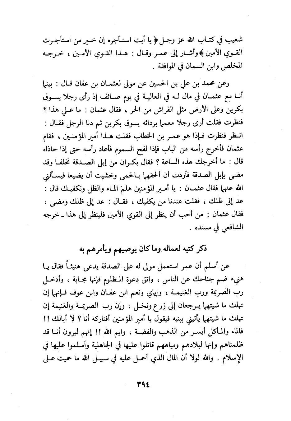 وعن محمد بن علي بن الحسين عن مولى لعثمان بن عفان قال: بينما أنا مع عثمان في مال له في العالية في يوم صائف إذ رأى رجلًا يسوق بكرين وعلى الأرض مثل الفراش من الحر، فقال عثمان: ما على هذا? فنظرت فقلت: أرى رجلًا معممًا بردائه يسوق بكرين ثم دنا الرجل فقال: انظر فنظرت فإذا هو عمر بن الخطاب فقلت: هذا أمير المؤمنين، فقام عثمان فأخرج رأسه من الباب فإذا لفح السموم فأعاد رأسه حتى إذا حاذاه قال: ما أخرجك هذه الساعة? فقال: بكران من إبل الصدقة تخلفا وقد مضى بإبل الصدقة, فأردت أن ألحقهما بالحمى وخشيت أن يضيعا فيسألني الله عنهما فقال عثمان: يا أمير المؤمنين هلم الماء والظل ونكفيك قال: عد إلى ظلك، فقلت: عندنا من يكفيك، فقال: عد إلى ظلك ومضى، فقال عثمان: من أحب أن ينظر إلى القوي الأمين فلينظر إلى هذا, خرجه الشافعي في مسنده.