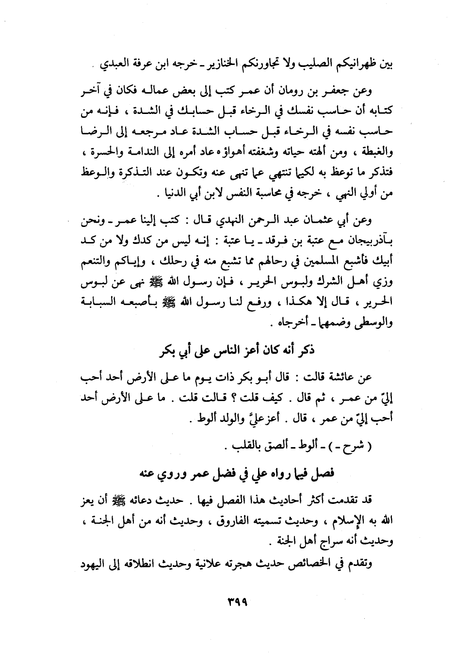قد تقدمت أكثر أحاديث هذا الفصل فيها، حديث دعائه -صلى الله عليه وسلم- أن يعز الله به الإسلام، وحديث تسميته الفاروق، وحديث أنه من أهل الجنة، وحديث أنه سراج أهل الجنة.