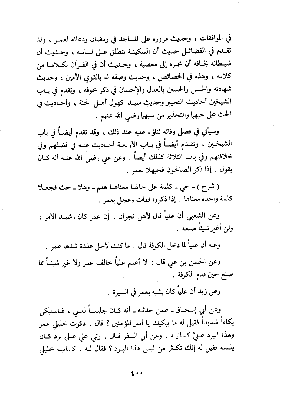 وسيأتي في فصل وفاته ثناؤه عليه عند ذلك، وقد تقدم أيضًا في باب الشيخين، وتقدم أيضًا في باب الأربعة أحاديث عنه في فضلهم وفي خلافتهم, وفي باب الثلاثة كذلك أيضًا. وعن علي -رضي الله عنه- أنه كان يقول: إذا ذكر الصالحون فحيهلا بعمر.