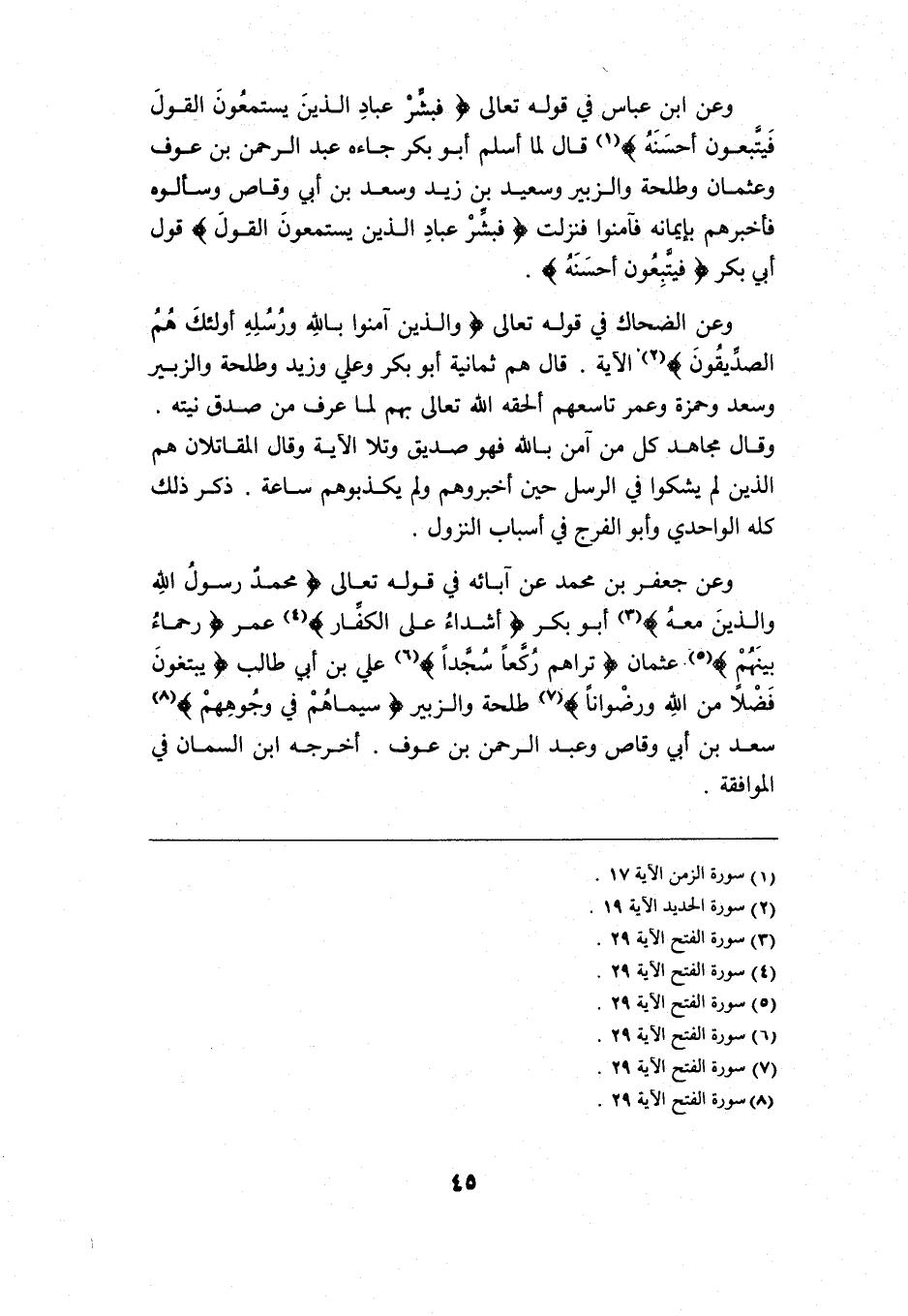 وعن ابن عباس في قوله تعالى: {فَبَشِّرْ عِبَادِ، الَّذِينَ يَسْتَمِعُونَ الْقَوْلَ فَيَتَّبِعُونَ أَحْسَنَهُ} 1 قال: لما أسلم أبو بكر جاءه عبد الرحمن بن عوف وعثمان وطلحة والزبير وسعيد بن زيد وسعد بن أبي وقاص وسألوه فأخبرهم بإيمانه, فآمنوا فنزلت: {فَبَشِّرْ عِبَادِ، الَّذِينَ يَسْتَمِعُونَ الْقَوْلَ} قول أبي بكر: {فَيَتَّبِعُونَ أَحْسَنَهُ} .