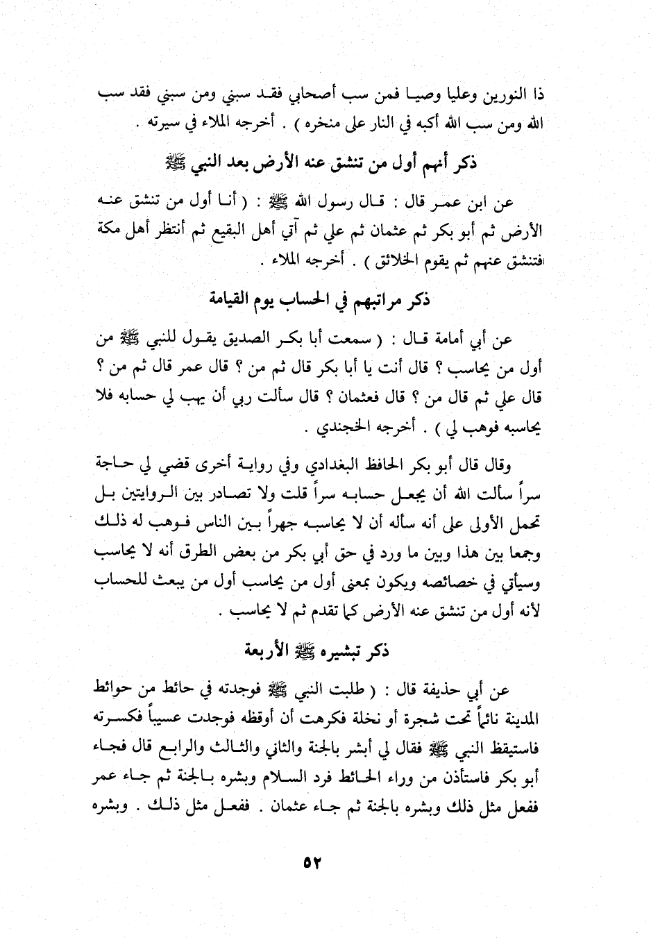 ذا النورين, وعليا وصيا, فمن سب أصحابي فقد سبني, ومن سبني فقد سب الله, ومن سب الله أكبه في النار على منخره" أخرجه الملاء في سيرته.