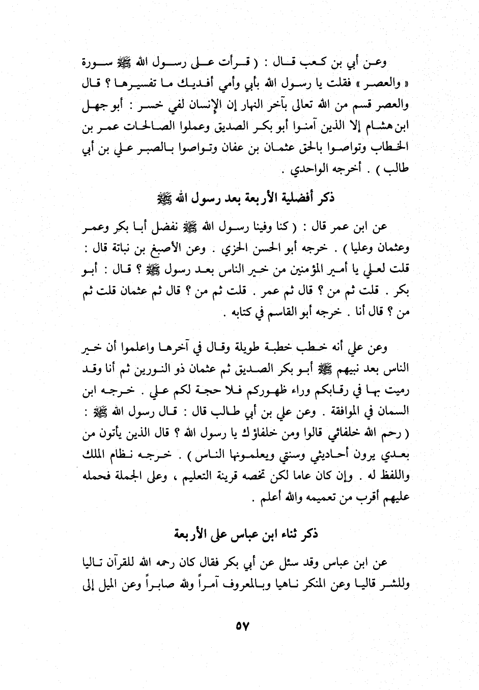 عن ابن عمر قال: "كنا وفينا رسول الله -صلى الله عليه وسلم- نفضل أبا بكر وعمر وعثمان وعليا" خرجه أبو الحسن الحزي. وعن الأصبغ بن نباتة قال: قلت لعلي: يا أمير المؤمنين, من خير الناس بعد رسول الله -صلى الله عليه وسلم؟ قال: أبو بكر قلت: ثم من؟ قال: ثم عمر قلت: ثم من؟ قال: ثم عثمان قلت: ثم من؟ قال: أنا, خرجه أبو القاسم في كتابه.
