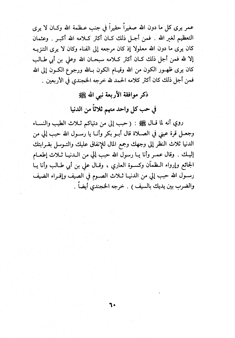 روي أنه لما قال -صلى الله عليه وسلم: "حبب إلي من دنياكم ثلاث: الطيب والنساء وجعل قرة عيني الصلاة" قال أبو بكر: وأنا يا رسول الله, حبب إلي من الدنيا ثلاث: النظر إلى وجهك وجمع المال للإنفاق عليك والتوسل بقرابتك إليك, وقال عمر: وأنا يا رسول الله, حبب إلي من الدنيا ثلاث: إطعام الجائع وإرواء الظمآن وكسوة العاري, وقال علي بن أبي طالب: وأنا يا رسول الله, حبب إلي من الدنيا ثلاث: الصوم في الصيف وإقراء الضيف والضرب بين يديك بالسيف. خرجه الخجندي أيضًا.
