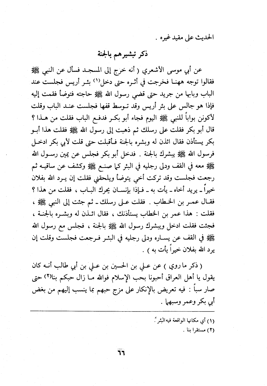 عن أبي موسى الأشعري "أنه خرج إلى المسجد فسأل عن النبي -صلى الله عليه وسلم- فقالوا: توجه ههنا, فخرجت في أثره حتى دخل1 بئر أريس فجلست عند الباب وبابها من جريد حتى قضى رسول الله -صلى الله عليه وسلم- حاجته, فتوضأ فقمت إليه فإذا هو جالس على بئر أريس وقد توسط قفها, فجلست عند الباب وقلت: لأكونن بوابًا للنبي -صلى الله عليه وسلم- اليوم فجاء أبو بكر فدفع الباب فقلت: من هذا؟ فقال: أبو بكر فقلت: على رسلك, ثم ذهبت إلى رسول الله -صلى الله عليه وسلم- فقلت: هذا أبو بكر يستأذن فقال: "ائذن له وبشره بالجنة" فأقبلت حتى قلت لأبي بكر: ادخل فرسول الله -صلى الله عليه وسلم- يبشرك بالجنة, فدخل أبو بكر فجلس عن يمين رسول الله -صلى الله عليه وسلم- معه في القف ودلى رجليه في البئر كما صنع صلى الله عليه وسلم وكشف عن ساقيه, ثم رجعت فجلست وقد تركت أخي يتوضأ ويلحقني فقلت: إن يرد الله بفلان خيرًا -يريد أخاه- يأت به, فإذا بإنسان يحرك الباب فقلت: من هذا؟ فقال: عمر بن الخطاب فقلت: على رسلك, ثم جئت إلى النبي -صلى الله عليه وسلم- فقلت: هذا عمر بن الخطاب يستأذنك فقال: "ائذن له وبشره بالجنة" فجئت فقلت: ادخل ويبشرك رسول الله -صلى الله عليه وسلم- بالجنة, فجلس مع رسول الله -صلى الله عليه وسلم- في القف عن يساره ودلى رجليه في البئر, فرجعت فجلست وقلت: إن يرد الله بفلان خيرًا يأت به".