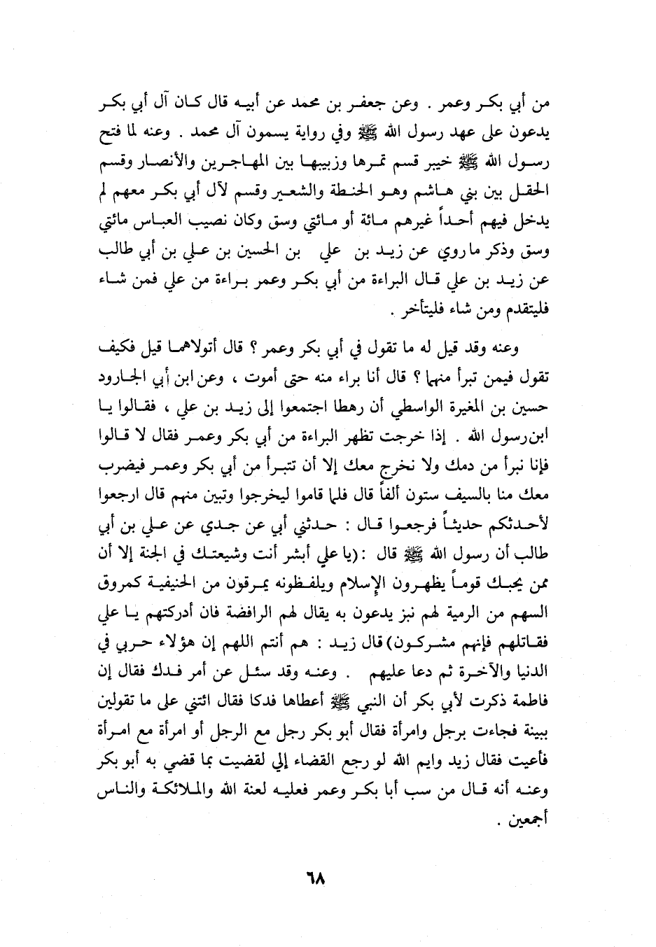 من أبي بكر وعمر. وعن جعفر بن محمد عن أبيه قال: كان آل أبي بكر يدعون على عهد رسول الله -صلى الله عليه وسلم- وفي رواية يسمون: آل محمد. وعنه لما فتح رسول الله -صلى الله عليه وسلم- خيبر قسم تمرها وزبيبها بين المهاجرين والأنصار وقسم الحقل بين بني هاشم وهو الحنطة والشعير, وقسم لآل أبي بكر معهم -لم يدخل فيهم أحدا غيرهم- مائة أو مائتي وسق وكان نصيب العباس مائتي وسق, وذكر ما روي عن زيد بن علي بن الحسين بن علي بن أبي طالب عن زيد بن علي قال: البراءة من أبي بكر وعمر براءة من علي, فمن شاء فليتقدم ومن شاء فليتأخر.