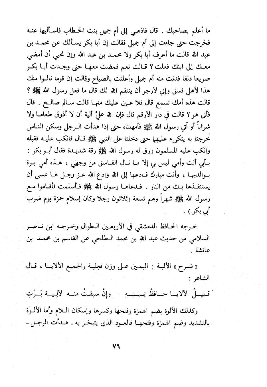 ما أعلم بصاحبك قال: فاذهبي إلى أم جميل بنت الخطاب فاسأليها عنه, فخرجت حتى جاءت إلى أم جميل فقالت: إن أبا بكر يسألك عن محمد بن عبد الله قالت: ما أعرف أبا بكر ولا محمد بن عبد الله, وإن تحبي أن أمضي معك إلى ابنك فعلت؟ قالت: نعم فمضت معها حتى وجدت أبا بكر صريعًا دنفًا فدنت منه أم جميل وأعلنت بالصياح وقالت: إن قومًا نالوا منك هذا لأهل فسق, وإني لأرجو أن ينتقم الله لك قال: ما فعل رسول الله -صلى الله عليه وسلم؟ قالت: هذه أمك تسمع قال: فلا عين عليك منها قالت: سالم صالح, قال: فأين هو؟ قالت: في دار الأرقم قال: فإن لله علي ألية أن لا أذوق طعامًا ولا شرابًا أو آتي رسول الله -صلى الله عليه وسلم- فأمهلناه حتى إذا هدأت الرجل وسكن الناس خرجتا به يتكئ عليهما حتى دخلتا على النبي -صلى الله عليه وسلم- قال: فانكب عليه فقبله وانكب عليه المسلمون ورق له رسول الله -صلى الله عليه وسلم- رقة شديدة فقال أبو بكر: بأبي أنت وأمي ليس بي إلا ما نال الفاسق من وجهي, هذه أمي برة بوالديها, وأنت مبارك فادعها إلى الله وادع الله -عز وجل- لها عسى أن يستنقذها بك من النار, فدعاها رسول الله -صلى الله عليه وسلم- فأسلمت فأقاموا مع رسول الله -صلى الله عليه وسلم- شهرًا وهم تسعة وثلاثون رجلًا, وكان إسلام حمزة يوم ضرب أبي بكر".