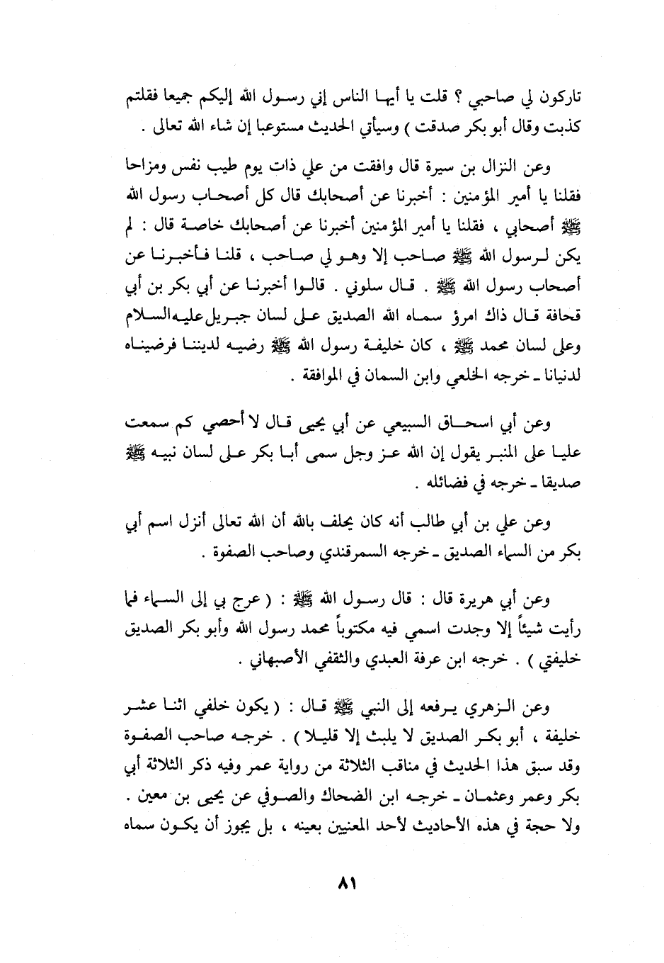 وعن الزهري يرفعه إلى النبي -صلى الله عليه وسلم- قال: "يكون خلفي اثنا عشر خليفة, أبو بكر الصديق لا يلبث إلا قليلًا" خرجه صاحب الصفوة وقد سبق هذا الحديث في مناقب الثلاثة من رواية عمر, وفيه ذكر الثلاثة: أبي بكر وعمر وعثمان, خرجه ابن الضحاك والصوفي عن يحيى بن معين. ولا حجة في هذه الأحاديث لأحد المعنيين بعينه، بل يجوز أن يكون سماه