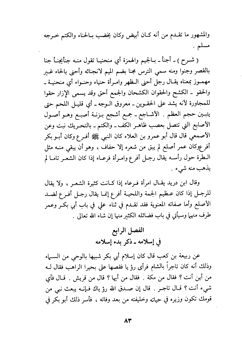 "شرح" أجنأ بالجيم والهمزة أي: منحنيًا, تقول منه: جنأ يجنأ جنا بالقصر وجنوا, ومنه سمي الترس مجنا -بضم الميم- لانجنائه وأحنى بالحاء غير مهموز بمعناه, يقال: رجل أحنى الظهر وامرأة حنياء وحنواء أي: منحنية, والحقو: الكشح والحقوان: الكشحان والجمع: أحق وقد يسمى الإزار حقوا للمجاورة؛ لأنه يشد على الحقوين, معروق الوجه أي: قليل اللحم حتى يتبين حجم العظم, الأشاجع: جمع أشجع بزنة أصبع وهي أصول الأصابع التي تتصل بعصب ظاهر الكف, والكتم بالتحريك: نبت, وعن الأصمعي قال: قال أبو عمرو بن العلاء: كان النبي -صلى الله عليه وسلم- أفرع وكان أبو بكر أفرع, وكان عمر أصلع لم يبق من شعره إلا حفاف, وهو أن يبقى منه مثل الطرة حول رأسه يقال: رجل أفرع وامرأة فرعاء, إذا كان الشعر تاما لم يذهب منه شيء.