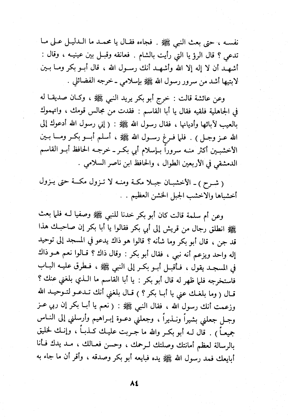 وعن عائشة قالت: خرج أبو بكر يريد النبي -صلى الله عليه وسلم- وكان صديقًا له في الجاهلية فلقيه فقال: يا أبا القاسم فقدت من مجالس قومك واتهموك بالعيب لآبائها وأديانها, فقال رسول الله -صلى الله عليه وسلم: "إني رسول الله أدعوك إلى الله عز وجل" فلما فرغ رسول الله -صلى الله عليه وسلم- أسلم أبو بكر وما بين الأخشبين أكثر منه سرورًا بإسلام أبي بكر, خرجه الحافظ أبو القاسم الدمشقي في الأربعين الطوال والحافظ ابن ناصر السلامي.