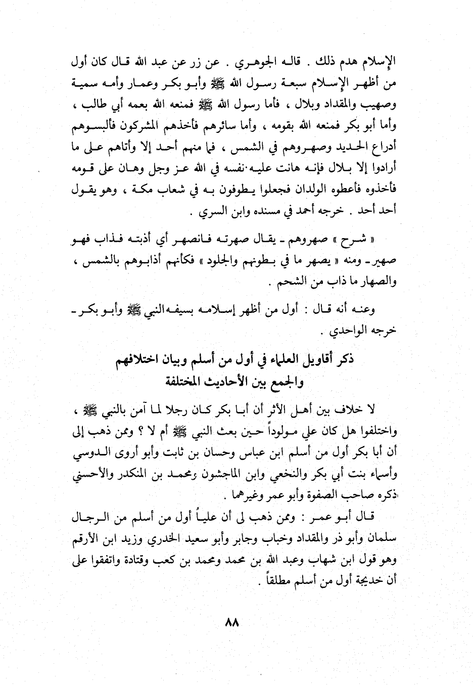 الإسلام هدم ذلك كله, قاله الجوهري. وعن زر عن عبد الله قال: كان أول من أظهر الإسلام سبعة: رسول الله -صلى الله عليه وسلم- وأبو بكر وعمار وأمه سمية وصهيب وبلال والمقداد, فأما رسول الله -صلى الله عليه وسلم- فمنعه الله بعمه أبي طالب, وأما أبو بكر فمنعه الله بقومه, وأما سائرهم فأخذهم المشركون فألبسوهم أدراع الحديد وصهروهم في الشمس, فما منهم من أحد إلا وأتاهم على ما أرادوا إلا بلال فإنه هانت عليه نفسه في الله -عز وجل- وهان على قومه, فأخذوه فأعطوه الولدان فجعلوا يطوفون به في شعاب مكة وهو يقول: أحد أحد, خرجه أحمد في مسنده وابن السري.