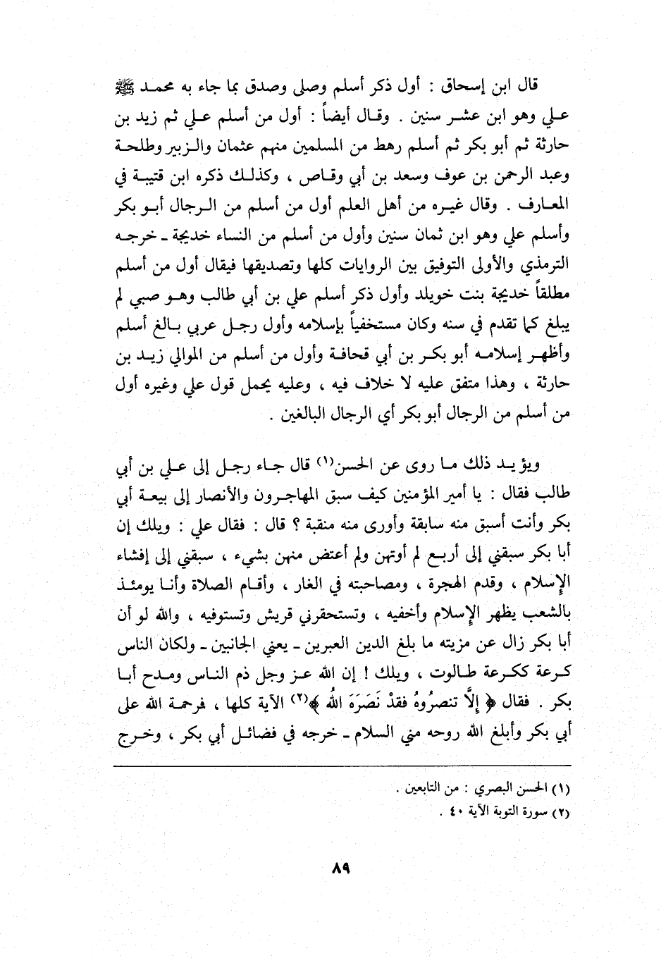 قال ابن إسحاق: أول ذكر أسلم وصلى وصدق بما جاء به محمد -صلى الله عليه وسلم- علي وهو ابن عشر سنين, وقال أيضًا: أول من أسلم علي ثم زيد بن حارثة ثم أبو بكر ثم أسلم رهط من المسلمين منهم: عثمان والزبير وطلحة وعبد الرحمن بن عوف وسعد بن أبي وقاص, وكذلك ذكره ابن قتيبة في المعارف, وقال غيره من أهل العلم: أول من أسلم من الرجال أبو بكر وأسلم علي وهو ابن ثماني سنين وأول من أسلم من النساء خديجة, خرجه الترمذي والأولى التوفيق بين الروايات كلها وتصديقها فيقال: أول من أسلم مطلقًا خديجة بنت خويلد, وأول ذكر أسلم علي بن أبي طالب وهو صبي لم يبلغ كما تقدم في سنه وكان مستخفيًا بإسلامه, وأول رجل عربي بالغ أسلم وأظهر إسلامه أبو بكر بن أبي قحافة, وأول من أسلم من الموالي زيد بن حارثة, وهذا متفق عليه لا خلاف فيه, وعليه يحمل قول علي وغيره: أول من أسلم من الرجال أبو بكر أي: من الرجال البالغين.