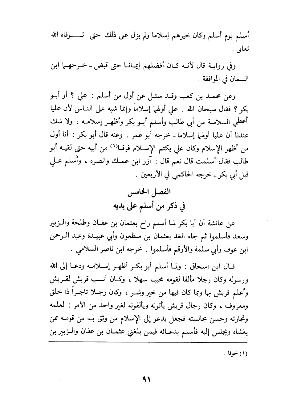 وعن محمد بن كعب وقد سئل عن أول من أسلم: علي أو أبو بكر؟ فقال: سبحان الله, علي أولهما إسلامًا وإنما شبه على الناس؛ لأن عليا أعطي السلامة من أبي طالب وأسلم أبو بكر وأظهر إسلامه, ولا شك عندنا أن عليا أولهما إسلامًا, خرجه أبو عمر. وعنه قال أبو بكر: أنا أول من أظهر الإسلام وكان علي يكتم الإسلام فرقًا1 من أبيه, حتى لقيه أبو طالب فقال: أسلمت؟ قال: نعم قال: آزر ابن عمك وانصره, وأسلم علي قبل أبي بكر, خرجه الحاكمي في الأربعين.