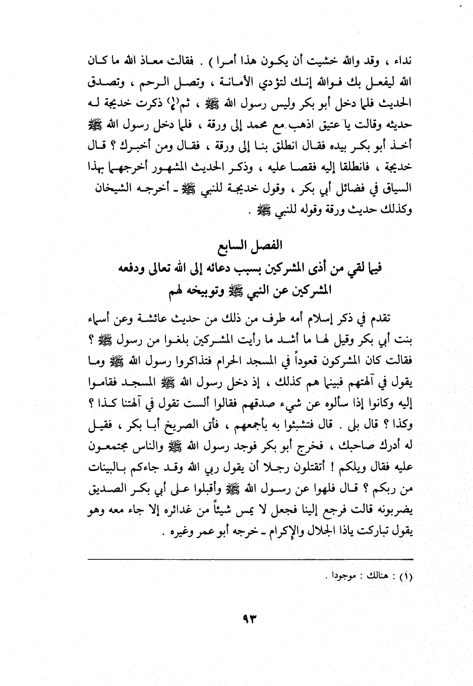 الفصل السابع: فيما لقي من أذى المشركين بسب دعائه إلى الله تعالى ودفعه المشركين عن النبي وتوبيخه لهم