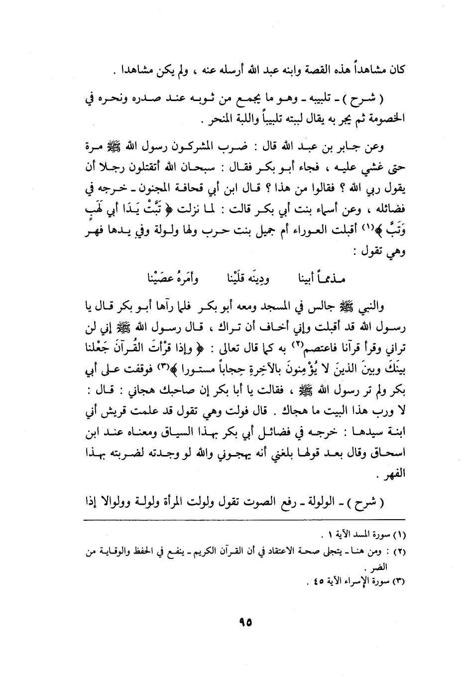 والنبي -صلى الله عليه وسلم- جالس في المسجد ومعه أبو بكر, فلما رآها أبو بكر قال: يا رسول الله قد أقبلت وإني أخاف أن تراك, قال رسول الله -صلى الله عليه وسلم: "إنها لن تراني" وقرأ قرآنًا فاعتصم2 به كما قال تعالى: {إِذَا قَرَأْتَ الْقُرْآنَ جَعَلْنَا بَيْنَكَ وَبَيْنَ الَّذِينَ لا يُؤْمِنُونَ بِالْآخِرَةِ حِجَابًا مَسْتُورًا} 3 فوقفت على أبي بكر ولم تر رسول الله -صلى الله عليه وسلم- فقالت: يا أبا بكر إن صاحبك هجاني قال: لا ورب هذا البيت ما هجاك قال: فولت وهي تقول: قد علمت قريش أني ابنة سيدها, خرجه في فضائل أبي بكر بهذا السياق, ومعناه عند ابن إسحاق وقال بعد قولها بلغني أنه يهجوني: والله لو وجدته لضربته بهذا الفهر.