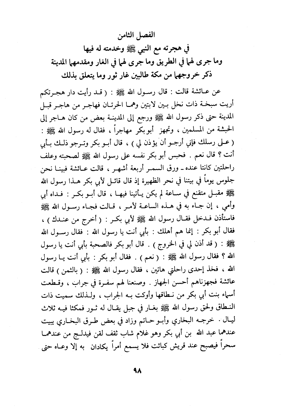 الفصل الثامن: في هجرته مع النبي -صلى الله عليه وسلم- وخدمته له فيها, وما جرى لهما في الطريق وما جرى لهما في الغار ومقدمهما المدينة, وذكر خروجهما من مكة طالبين غار ثور وما يتعلق بذلك