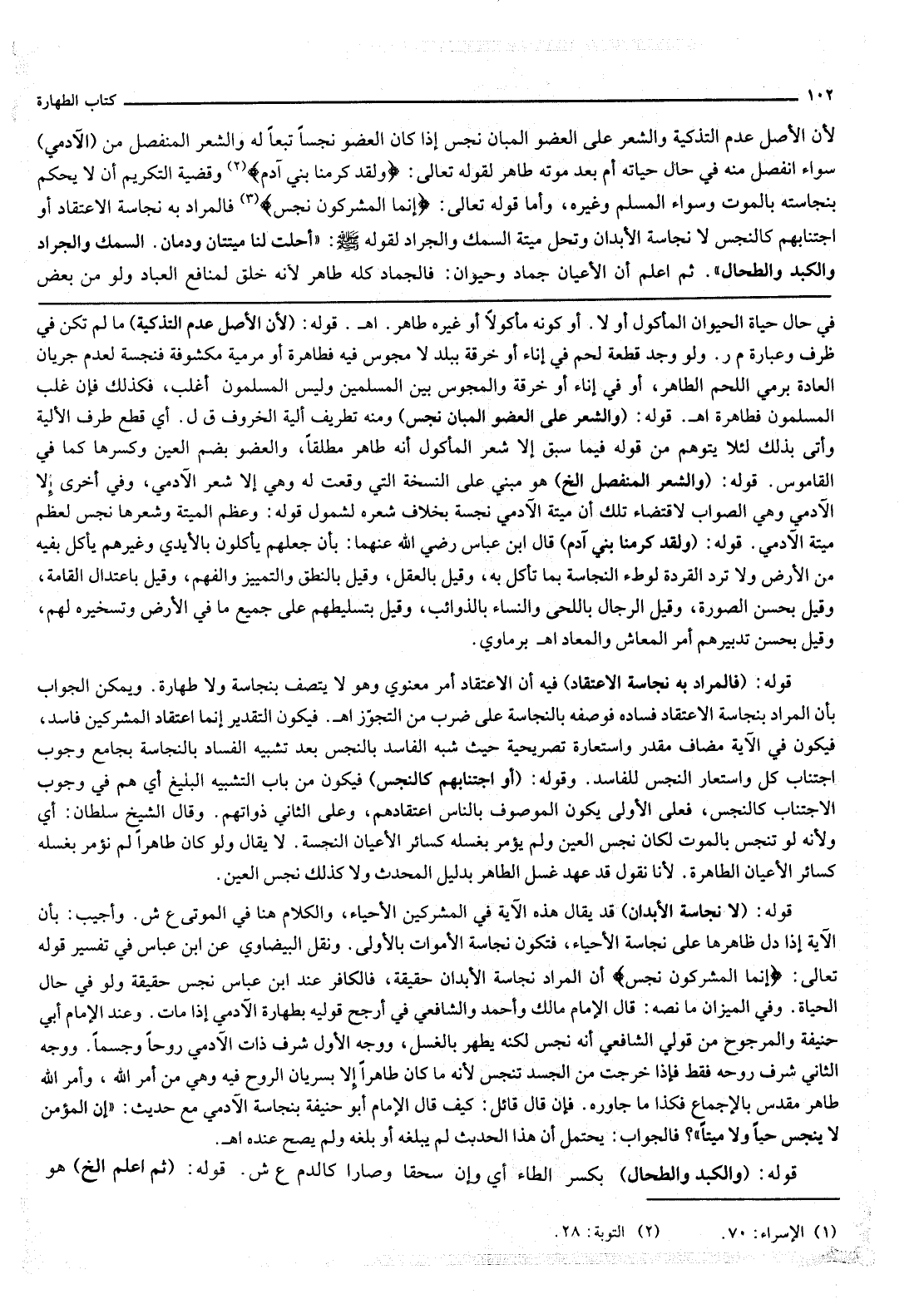 قَوْلُهُ: (فَالْمُرَادُ بِهِ نَجَاسَةُ الِاعْتِقَادِ) فِيهِ أَنَّ الِاعْتِقَادَ أَمْرٌ مَعْنَوِيٌّ وَهُوَ لَا يَتَّصِفُ بِنَجَاسَةٍ وَلَا طَهَارَةٍ. وَيُمْكِنُ الْجَوَابُ بِأَنَّ الْمُرَادَ بِنَجَاسَةِ الِاعْتِقَادِ فَسَادُهُ فَوَصَفَهُ بِالنَّجَاسَةِ عَلَى ضَرْبٍ مِنْ التَّجَوُّزِ اهـ. فَيَكُونُ التَّقْدِيرُ إنَّمَا اعْتِقَادُ الْمُشْرِكِينَ فَاسِدٌ، فَيَكُونُ فِي الْآيَةِ مُضَافٌ مُقَدَّرٌ وَاسْتِعَارَةٌ تَصْرِيحِيَّةٌ حَيْثُ شَبَّهَ الْفَاسِدَ بِالنَّجِسِ بَعْدَ تَشْبِيهِ الْفَسَادِ بِالنَّجَاسَةِ بِجَامِعِ وُجُوبِ اجْتِنَابِ كُلٍّ وَاسْتَعَارَ النَّجِسَ لِلْفَاسِدِ. وَقَوْلُهُ: (أَوْ اجْتِنَابُهُمْ كَالنَّجِسِ) فَيَكُونُ مِنْ بَابِ التَّشْبِيهِ الْبَلِيغِ أَيْ هُمْ فِي وُجُوبِ الِاجْتِنَابِ كَالنَّجِسِ، فَعَلَى الْأُولَى يَكُونُ الْمَوْصُوفُ بِالنَّاسِ اعْتِقَادَهُمْ، وَعَلَى الثَّانِي ذَوَاتَهمْ. وَقَالَ الشَّيْخُ سُلْطَانٌ: أَيْ وَلِأَنَّهُ لَوْ تَنَجَّسَ بِالْمَوْتِ لَكَانَ نَجِسَ الْعَيْنِ وَلَمْ يُؤْمَرْ بِغَسْلِهِ كَسَائِرِ الْأَعْيَانِ النَّجِسَةِ. لَا يُقَالُ وَلَوْ كَانَ طَاهِرًا لَمْ نُؤْمَرْ بِغَسْلِهِ كَسَائِرِ الْأَعْيَانِ الطَّاهِرَةِ. لِأَنَّا نَقُولُ قَدْ عُهِدَ غَسْلُ الطَّاهِرِ بِدَلِيلِ الْمُحْدِثِ وَلَا كَذَلِكَ نَجِسُ الْعَيْنِ.