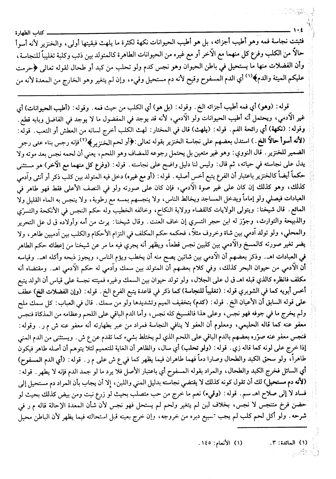 فَثَبَتَتْ نَجَاسَةُ فَمِهِ وَهُوَ أَطْيَبُ أَجْزَائِهِ، بَلْ هُوَ أَطْيَبُ الْحَيَوَانَاتِ نَكْهَةً لِكَثْرَةِ مَا يَلْهَثُ فَبَقِيَّتُهَا أَوْلَى، وَالْخِنْزِيرُ لِأَنَّهُ أَسْوَأُ حَالًا مِنْ الْكَلْبِ، وَفَرْعُ كُلٍّ مِنْهُمَا مَعَ الْآخَرِ أَوْ مَعَ غَيْرِهِ مِنْ الْحَيَوَانَاتِ الطَّاهِرَةِ كَالْمُتَوَلِّدِ بَيْنَ ذِئْبٍ وَكَلْبَةٍ تَغْلِيبًا لِلنَّجَاسَةِ، وَأَنَّ الْفَضَلَاتِ مِنْهَا مَا يَسْتَحِيلُ فِي بَاطِنِ الْحَيَوَانِ وَهُوَ نَجِسٌ كَدَمٍ وَلَوْ تَحَلَّبَ مِنْ كَبِدٍ أَوْ طِحَالٍ لِقَوْلِهِ تَعَالَى {حُرِّمَتْ عَلَيْكُمُ الْمَيْتَةُ وَالدَّمُ} [المائدة: 3] أَيْ الدَّمُ الْمَسْفُوحُ وَقَيْحٍ لِأَنَّهُ دَمٌ مُسْتَحِيلٌ وَقَيْءٍ، وَإِنْ لَمْ يَتَغَيَّرْ وَهُوَ الْخَارِجُ مِنْ الْمَعِدَةِ لِأَنَّهُ مِنْ