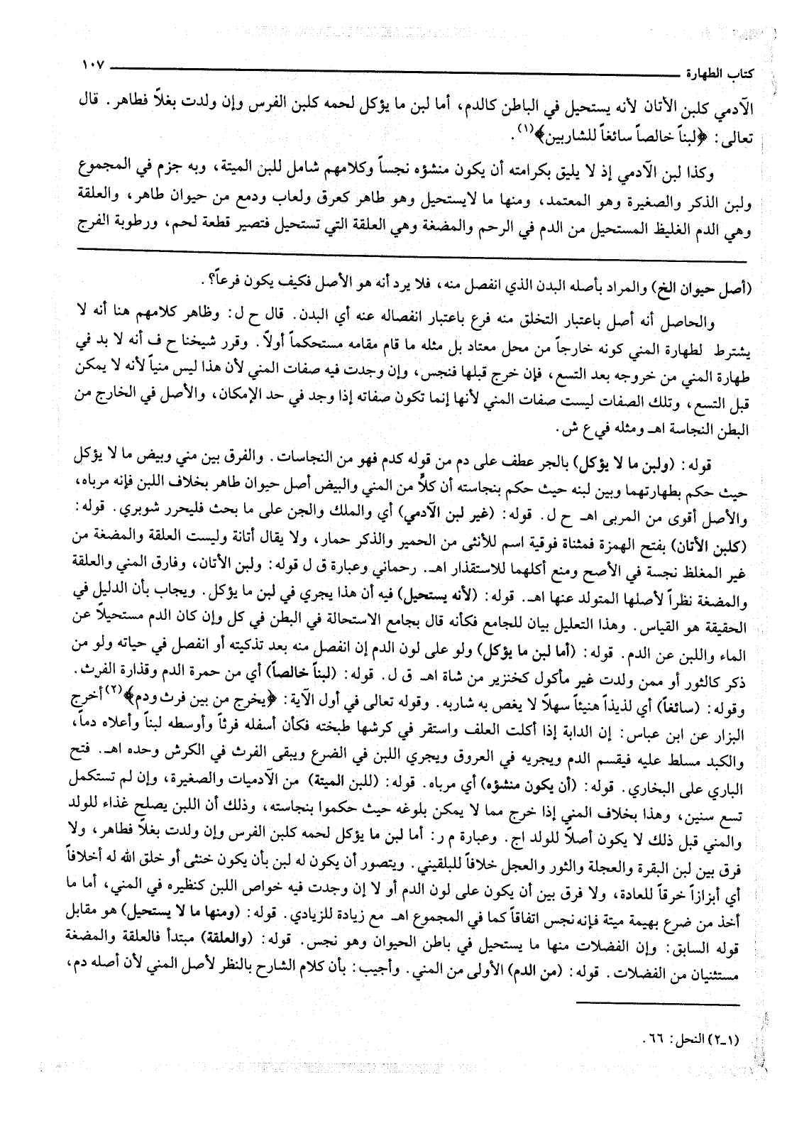 قَوْلُهُ: (وَمِنْهَا مَا لَا يَسْتَحِيلُ) هُوَ مُقَابِلُ قَوْلِهِ السَّابِقِ: وَإِنَّ الْفَضَلَاتِ مِنْهَا مَا يَسْتَحِيلُ فِي بَاطِنِ الْحَيَوَانِ وَهُوَ نَجِسٌ. قَوْلُهُ: (وَالْعَلَقَةُ) مُبْتَدَأٌ فَالْعَلَقَةُ وَالْمُضْغَةُ مُسْتَثْنَيَانِ مِنْ الْفَضَلَاتِ.