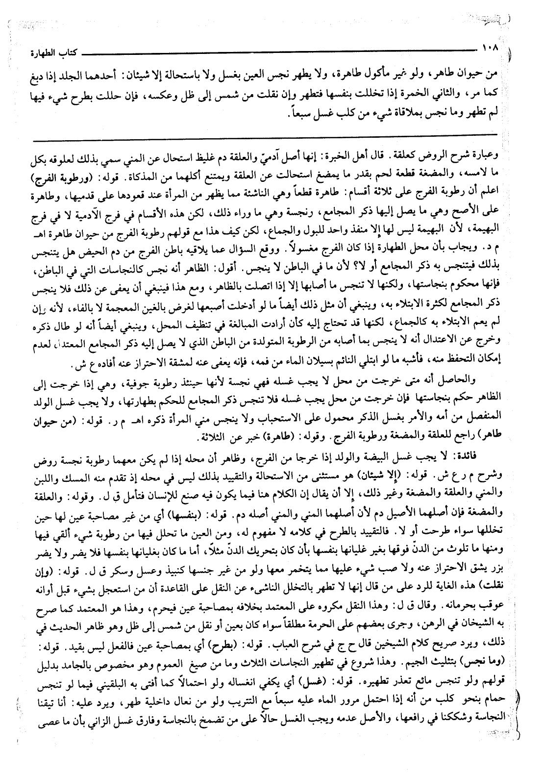 قَوْلُهُ: (وَرُطُوبَةُ الْفَرْجِ) اعْلَمْ أَنَّ رُطُوبَةَ الْفَرْجِ عَلَى ثَلَاثَةِ أَقْسَامٍ: طَاهِرَةٌ قَطْعًا وَهِيَ النَّاشِئَةُ مِمَّا يَظْهَرُ مِنْ الْمَرْأَةِ عِنْدَ قُعُودِهَا عَلَى قَدَمَيْهَا، وَطَاهِرَةٌ عَلَى الْأَصَحِّ وَهِيَ مَا يَصِلُ إلَيْهَا ذَكَرُ الْمُجَامِعِ، وَنَجِسَةٌ وَهِيَ مَا وَرَاءَ ذَلِكَ، لَكِنَّ هَذِهِ الْأَقْسَامَ فِي فَرْجِ الْآدَمِيَّةِ لَا فِي فَرْجِ الْبَهِيمَةِ، لِأَنَّ الْبَهِيمَةَ لَيْسَ لَهَا إلَّا مَنْفَذٌ وَاحِدٌ لِلْبَوْلِ وَالْجِمَاعِ، لَكِنْ كَيْفَ هَذَا مَعَ قَوْلِهِمْ رُطُوبَةُ الْفَرْجِ مِنْ حَيَوَانٍ طَاهِرَةٌ. اهـ. م د. وَيُجَابُ بِأَنَّ مَحَلَّ الطَّهَارَةِ إذَا كَانَ الْفَرْجُ مَغْسُولًا. وَوَقَعَ السُّؤَالُ عَمَّا يُلَاقِيهِ بَاطِنُ الْفَرْجِ مِنْ دَمِ الْحَيْضِ هَلْ يَتَنَجَّسُ بِذَلِكَ فَيَتَنَجَّسُ بِهِ ذَكَرُ الْمُجَامِعِ أَوْ لَا؟ لِأَنَّ مَا فِي الْبَاطِنِ لَا يَنْجُسُ.