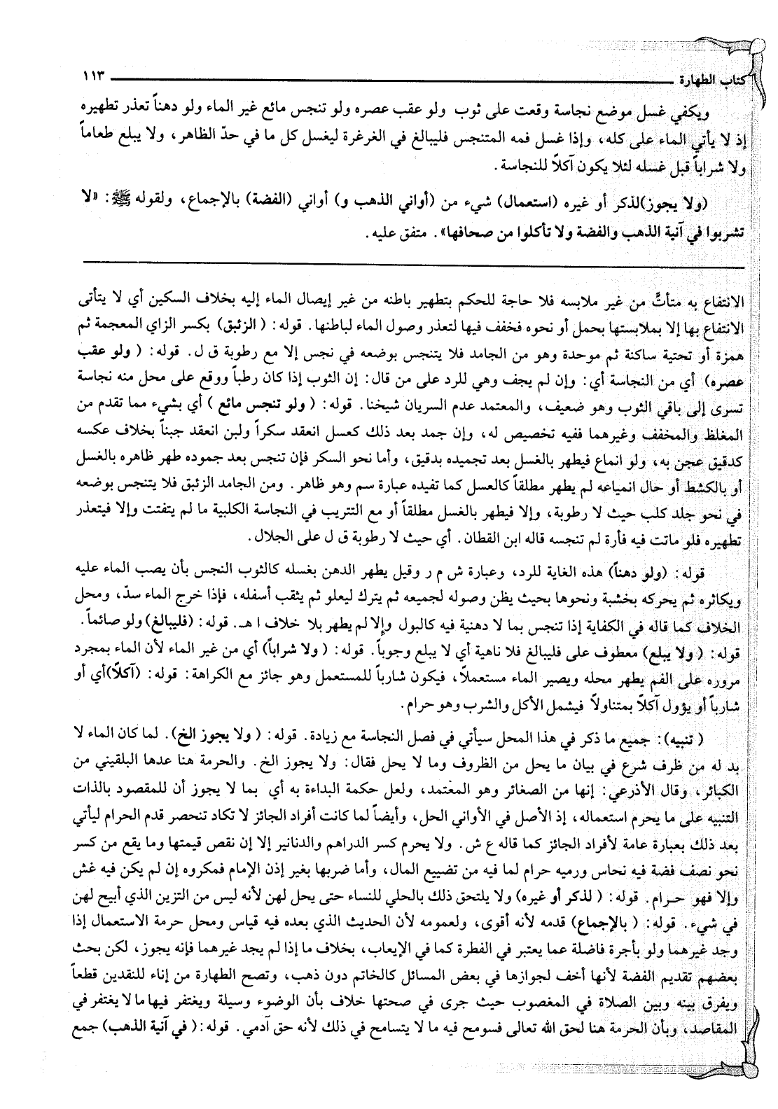 قَوْلُهُ: (وَلَا شَرَابًا) أَيْ مِنْ غَيْرِ الْمَاءِ لِأَنَّ الْمَاءَ بِمُجَرَّدِ مُرُورِهِ عَلَى الْفَمِ يَطْهُرُ مَحَلُّهُ وَيَصِيرُ الْمَاءُ مُسْتَعْمَلًا، فَيَكُونُ شَارِبًا لِلْمُسْتَعْمَلِ وَهُوَ جَائِزٌ مَعَ الْكَرَاهَةِ: قَوْلُهُ: (آكِلًا) أَيْ أَوْ شَارِبًا أَوْ يُؤَوَّلُ آكِلًا بِمُتَنَاوَلًا فَيَشْمَلُ الْأَكْلَ وَالشُّرْبَ وَهُوَ حَرَامٌ.