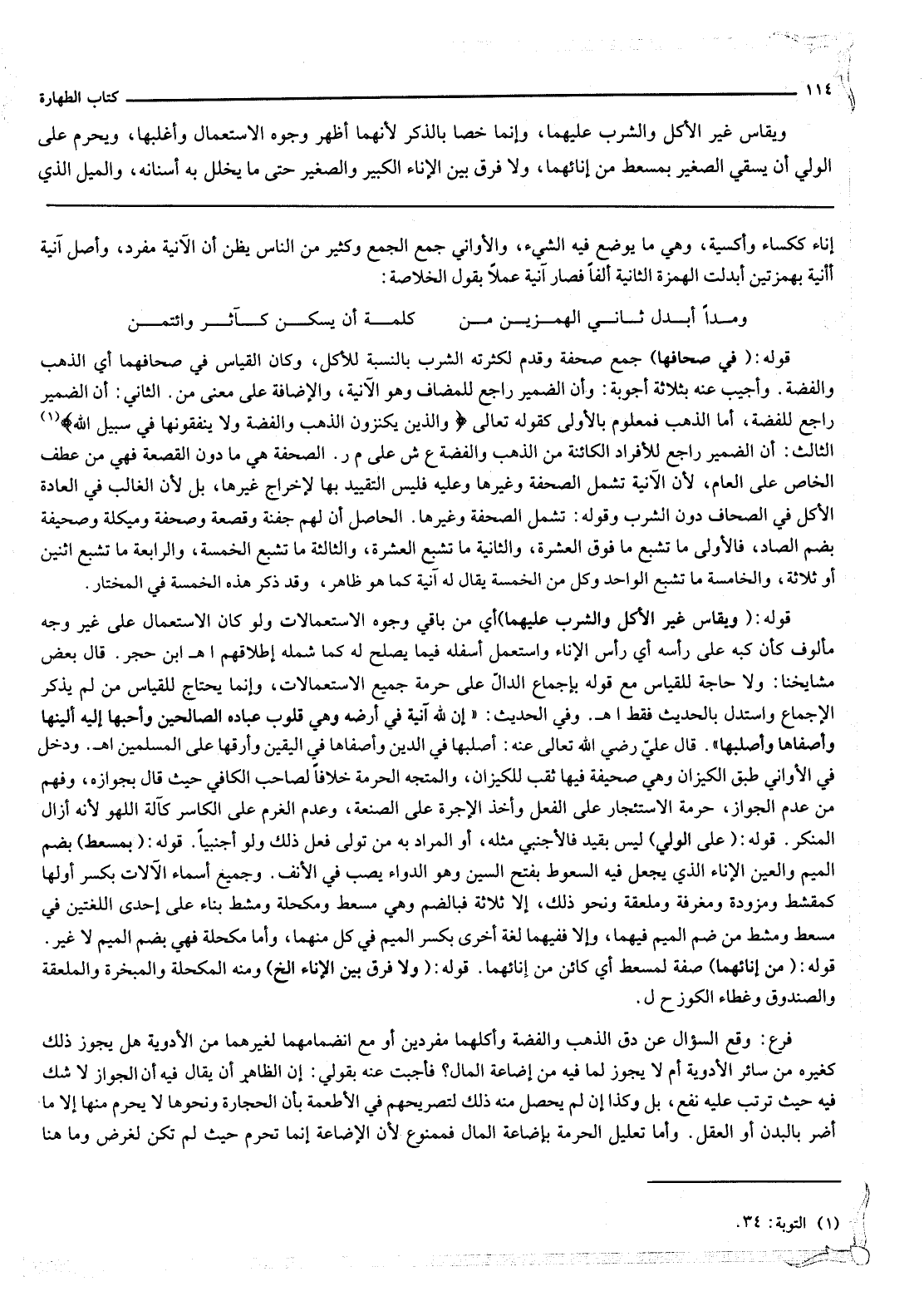قَوْلُهُ: (فِي صِحَافِهَا) جَمْعُ صَحْفَةٍ وَقَدَّمَ الشُّرْبَ لِكَثْرَتِهِ بِالنِّسْبَةِ لِلْأَكْلِ، وَكَانَ الْقِيَاسُ فِي صِحَافِهِمَا أَيْ الذَّهَبِ وَالْفِضَّةِ. وَأُجِيبَ عَنْهُ بِثَلَاثَةِ أَجْوِبَةٍ: الْأَوَّلُ أَنَّ الضَّمِيرَ رَاجِعٌ لِلْمُضَافِ وَهُوَ الْآنِيَةُ، وَالْإِضَافَةُ عَلَى مَعْنَى مِنْ. الثَّانِي: أَنَّ الضَّمِيرَ رَاجِعٌ لِلْفِضَّةِ، أَمَّا الذَّهَبُ فَمَعْلُومٌ بِالْأُولَى كَقَوْلِهِ تَعَالَى {وَالَّذِينَ يَكْنِزُونَ الذَّهَبَ وَالْفِضَّةَ وَلا يُنْفِقُونَهَا فِي سَبِيلِ اللَّهِ} [التوبة: 34] الثَّالِثُ: أَنَّ الضَّمِيرَ رَاجِعٌ لِلْأَفْرَادِ الْكَائِنَةِ مِنْ الذَّهَبِ وَالْفِضَّةِ ع ش عَلَى م ر. الصَّحْفَةُ هِيَ مَا دُونَ الْقَصْعَةِ فَهِيَ مِنْ عَطْفِ الْخَاصِّ عَلَى الْعَامِّ، لِأَنَّ الْآنِيَةَ تَشْمَلُ الصَّحْفَةَ وَغَيْرَهَا وَعَلَيْهِ فَلَيْسَ التَّقْيِيدُ بِهَا لِإِخْرَاجِ غَيْرِهَا، بَلْ لِأَنَّ الْغَالِبَ فِي الْعَادَةِ الْأَكْلُ فِي الصِّحَافِ دُونَ الشُّرْبِ وَقَوْلُهُ: تَشْمَلُ الصَّحْفَةَ وَغَيْرَهَا. الْحَاصِلُ أَنَّ لَهُمْ جَفْنَةً وَقَصْعَةً وَصَحْفَةً وَمِكْيَلَةً وَصُحَيْفَةً بِضَمِّ الصَّادِ، فَالْأُولَى مَا تُشْبِعُ مَا فَوْقَ الْعَشَرَةِ، وَالثَّانِيَةُ مَا تُشْبِعُ الْعَشَرَةَ، وَالثَّالِثَةُ مَا تُشْبِعُ الْخَمْسَةَ، وَالرَّابِعَةُ مَا تُشْبِعُ اثْنَيْنِ أَوْ ثَلَاثَةً، وَالْخَامِسَةُ مَا تُشْبِعُ الْوَاحِدَ، وَكُلٌّ مِنْ الْخَمْسَةِ يُقَالُ لَهُ آنِيَةٌ كَمَا هُوَ ظَاهِرٌ، وَقَدْ ذَكَرَ هَذِهِ الْخَمْسَةَ فِي الْمُخْتَارِ.