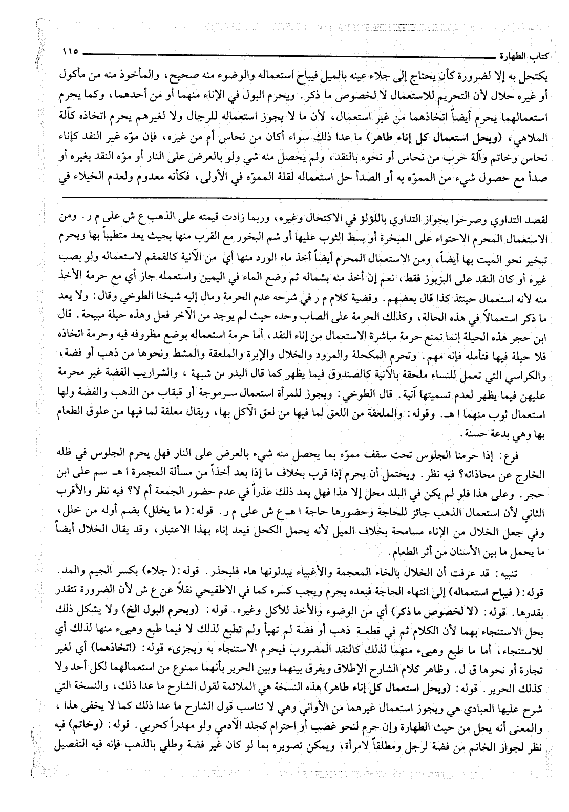 يُكْتَحَلُ بِهِ إلَّا لِضَرُورَةٍ كَأَنْ يَحْتَاجَ إلَى جِلَاءِ عَيْنِهِ بِالْمِيلِ فَيُبَاحُ اسْتِعْمَالُهُ، وَالْوُضُوءُ مِنْهُ صَحِيحٌ، وَالْمَأْخُوذُ مِنْهُ مِنْ مَأْكُولٍ أَوْ غَيْرِهِ حَلَالٌ لِأَنَّ التَّحْرِيمَ لِلِاسْتِعْمَالِ لَا لِخُصُوصِ مَا ذُكِرَ. وَيَحْرُمُ الْبَوْلُ فِي الْإِنَاءِ مِنْهُمَا أَوْ مِنْ أَحَدِهِمَا، وَكَمَا يَحْرُمُ اسْتِعْمَالُهُمَا يَحْرُمُ أَيْضًا اتِّخَاذُهُمَا مِنْ غَيْرِ اسْتِعْمَالٍ، لِأَنَّ مَا لَا يَجُوزُ اسْتِعْمَالُهُ لِلرِّجَالِ وَلَا لِغَيْرِهِمْ يَحْرُمُ اتِّخَاذُهُ كَآلَةِ الْمَلَاهِي، (وَيَحِلُّ اسْتِعْمَالُ كُلِّ إنَاءٍ طَاهِرٍ) مَا عَدَا ذَلِكَ سَوَاءٌ أَكَانَ مِنْ نُحَاسٍ أَمْ مِنْ غَيْرِهِ، فَإِنْ مُوِّهَ غَيْرُ النَّقْدِ كَإِنَاءِ نُحَاسٍ وَخَاتَمٍ وَآلَةِ حَرْبٍ مِنْ نُحَاسٍ أَوْ نَحْوِهِ بِالنَّقْدِ، وَلَمْ يَحْصُلْ مِنْهُ شَيْءٌ وَلَوْ بِالْعَرْضِ عَلَى النَّارِ أَوْ مُوِّهَ النَّقْدُ بِغَيْرِهِ أَوْ صَدَأٌ مَعَ حُصُولِ شَيْءٍ مِنْ الْمُمَوَّهِ بِهِ أَوْ الصَّدَأِ حَلَّ اسْتِعْمَالُهُ لِقِلَّةِ الْمُمَوِّهِ فِي الْأُولَى فَكَأَنَّهُ مَعْدُومٌ وَلِعَدَمِ الْخُيَلَاءِ فِي